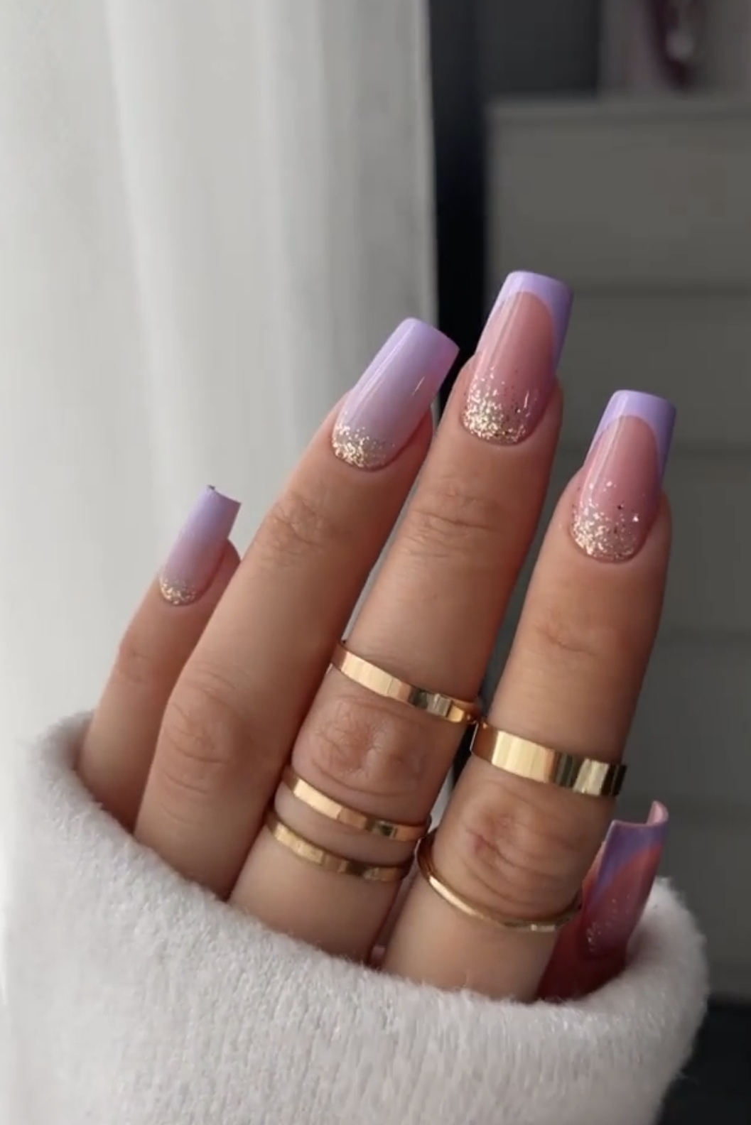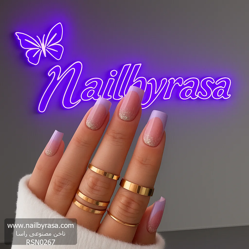 ناخن مصنوعی راسا طرح فرنچ و آمبره شاین رنگ یاسی طلایی