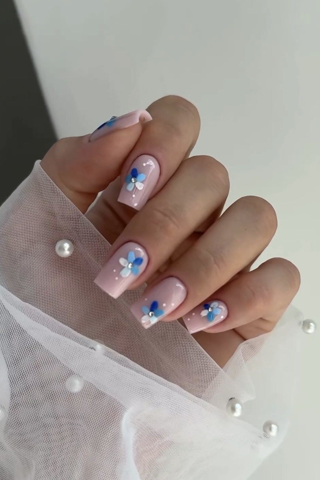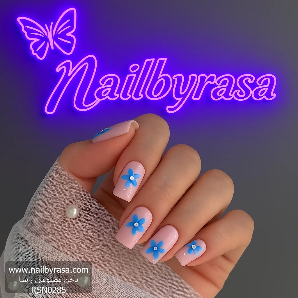 ناخن مصنوعی راسا طرح گل بابونه آبی رنگ بیس هلویی