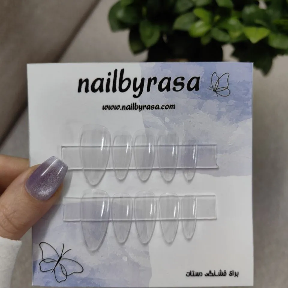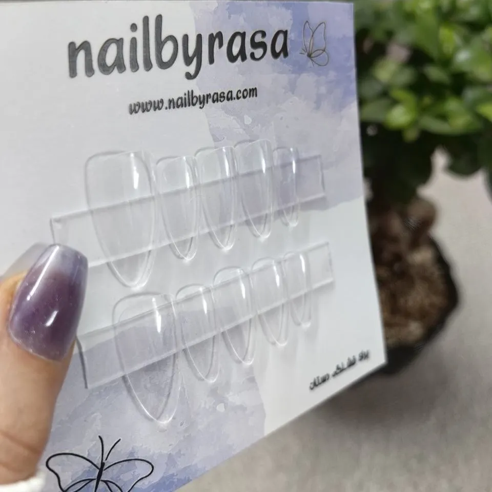 ناخن مصنوعی راسا فرم بادومی شیشه ای بی رنگ ، مناسب استفاده روزمره و مهمانی با نصب آسان و قابلیت استفاده چندباره.