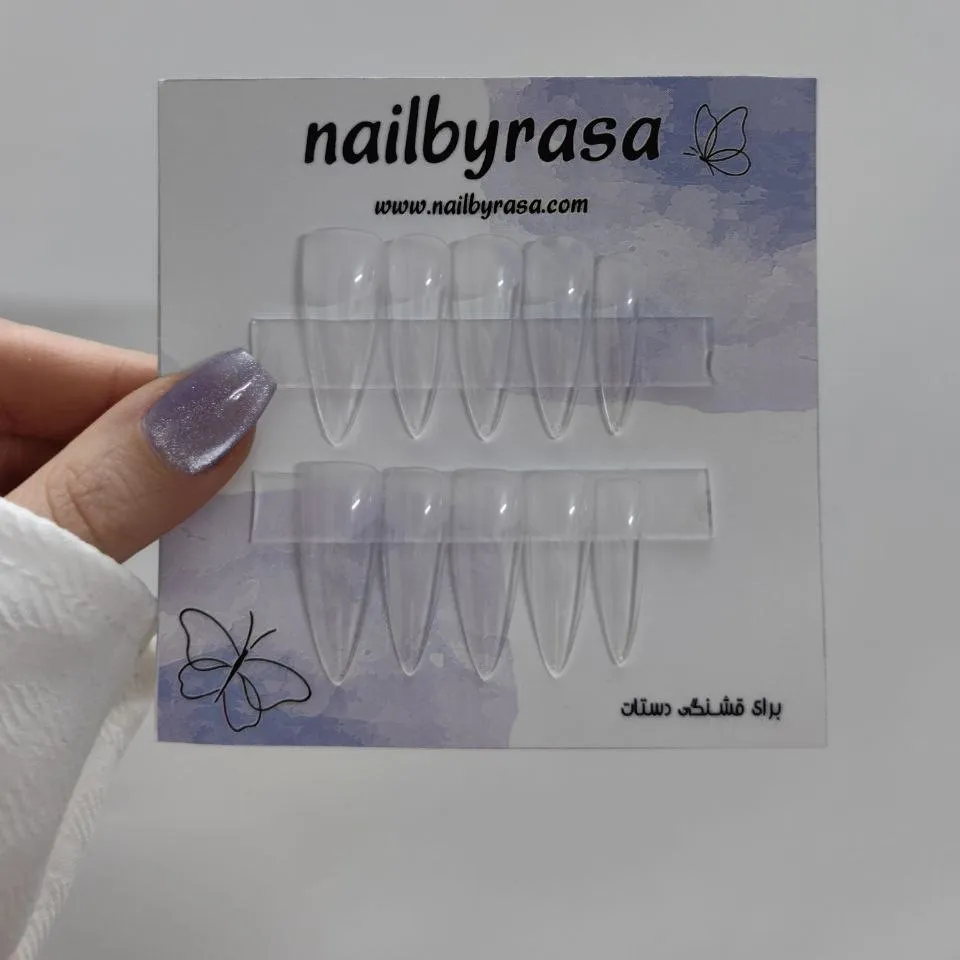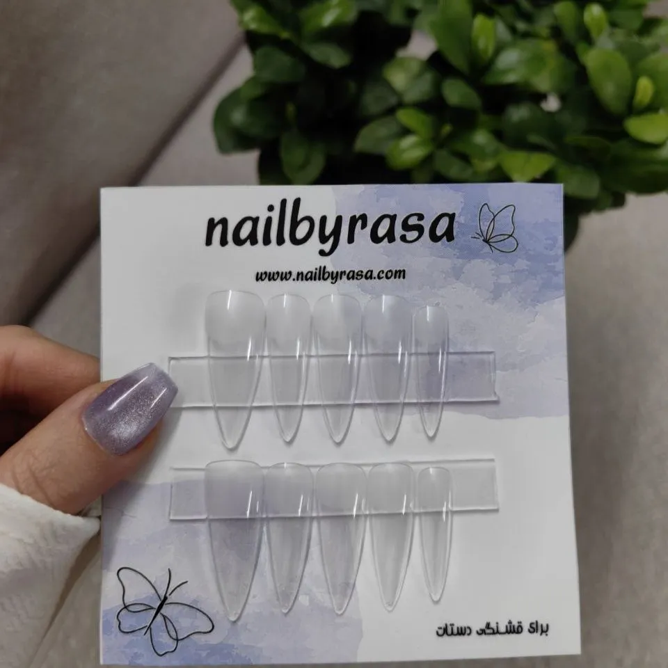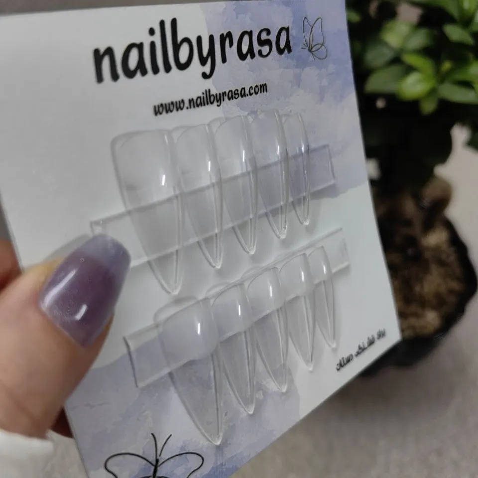 ناخن مصنوعی راسا فرم بادومی بلند شیشه ای بی رنگ ، مناسب استفاده روزمره و مهمانی با نصب آسان و قابلیت استفاده چندباره.