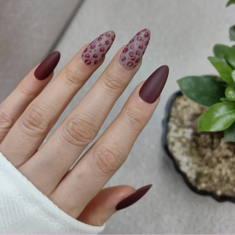 - جادوی زرشکی مات: ناخنهای اصلی با رنگ زرشکی شرابی عمیق و فینیش مات پوشیده شدهاند. رنگ زرشکی نماد اصالت و جذابیت است. برای مشاهده تنوع این رنگ، به دسته ناخن مصنوعی زرشکی مراجعه کنید.