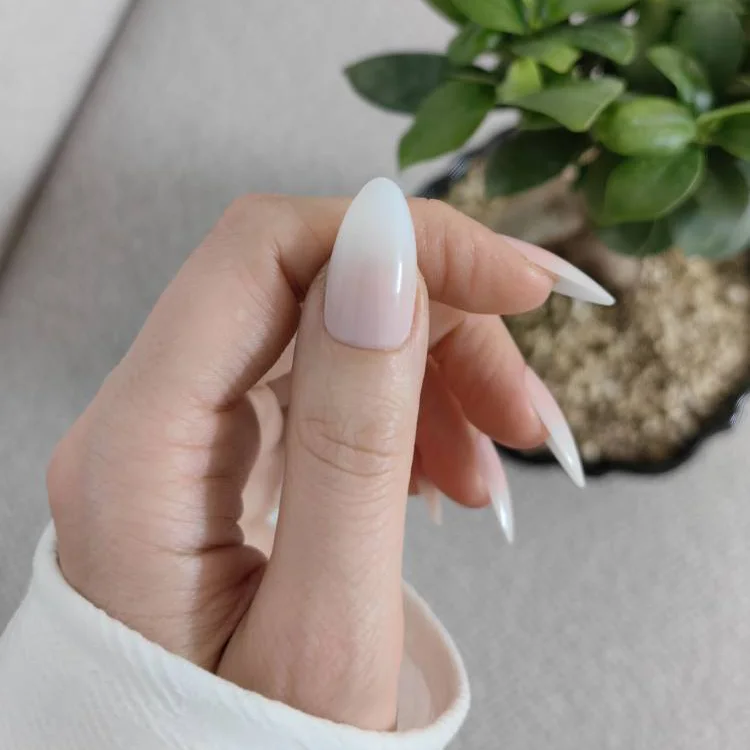 - تکنیک آمبره (Ombre): رنگ صورتی هلویی از ریشه شروع شده و به آرامی در نوک ناخن به سفید شیری تبدیل میشود. این تکنیک که به “کاشت گریم” هم معروف است، تخصصیترین مدل در دسته ناخن مصنوعی بیبی بومر است.