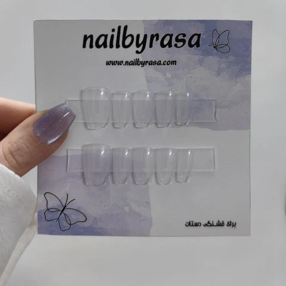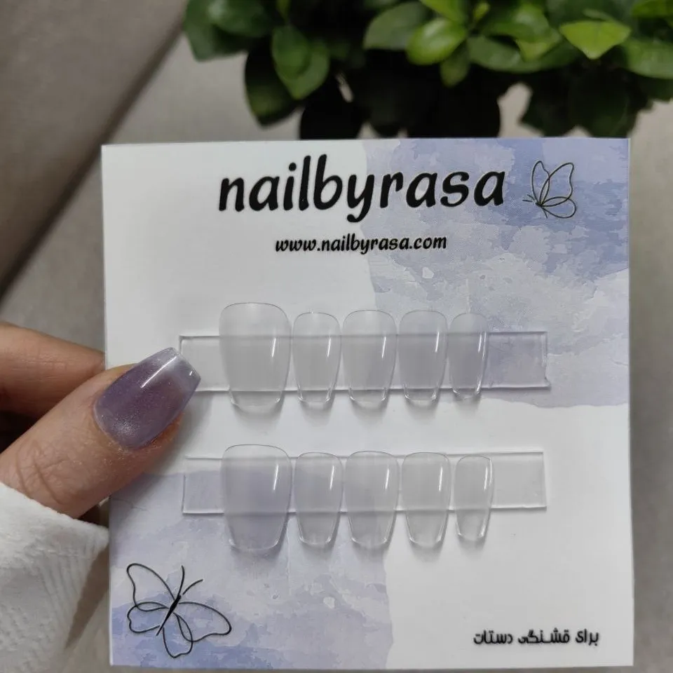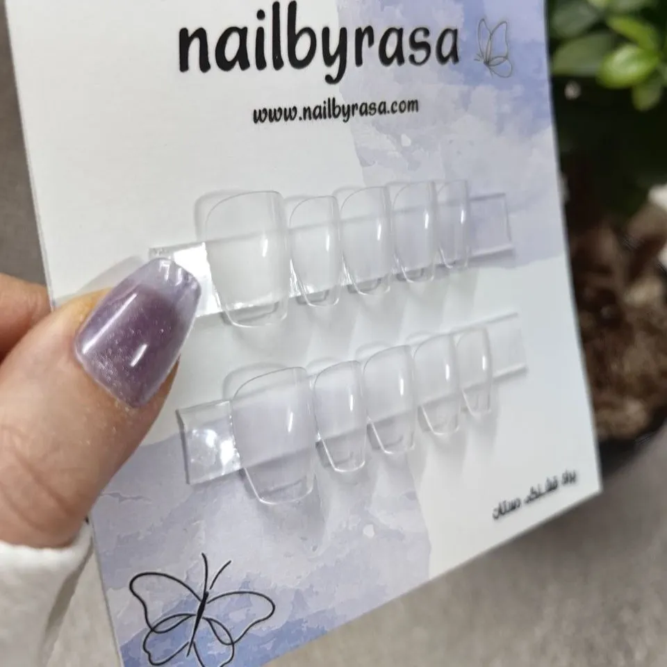 ست ناخن مصنوعی راسا فرم گلدانی کوتاه شیشه ای بی رنگ ، مناسب استفاده روزمره و مهمانی با نصب آسان و قابلیت استفاده چندباره