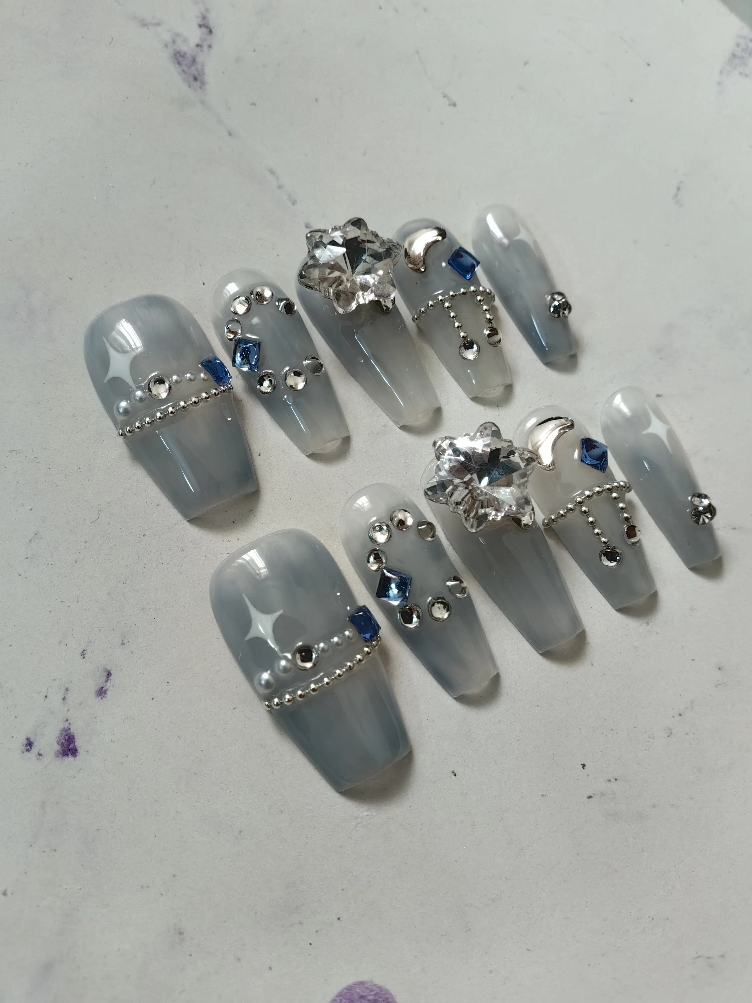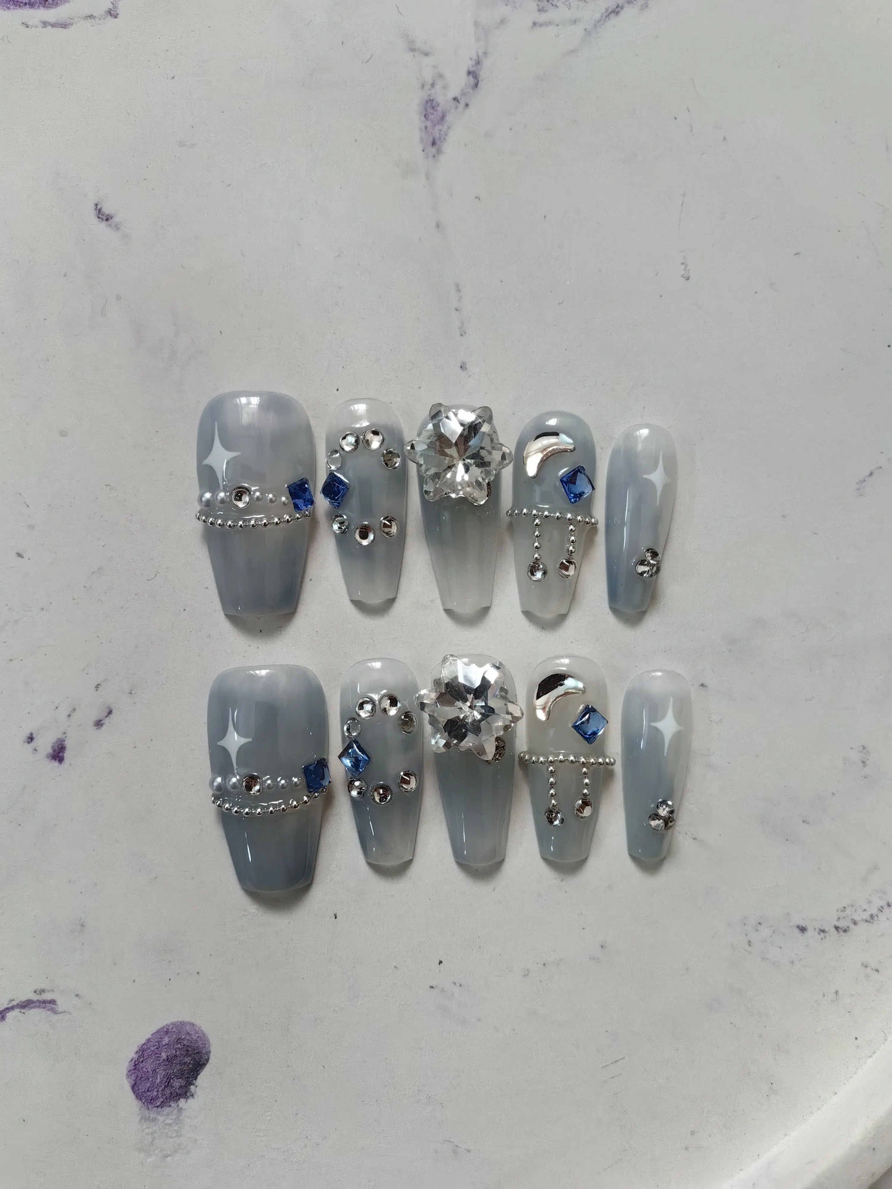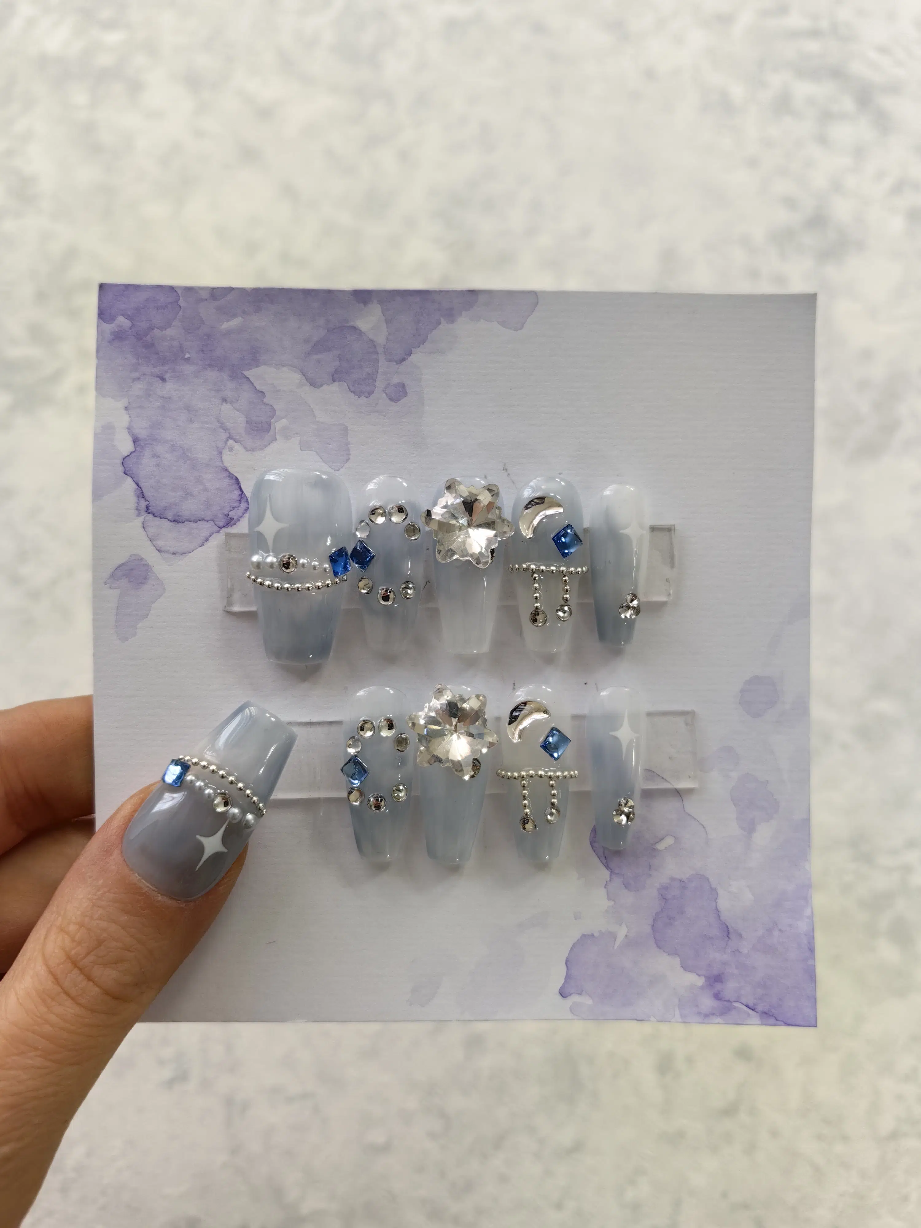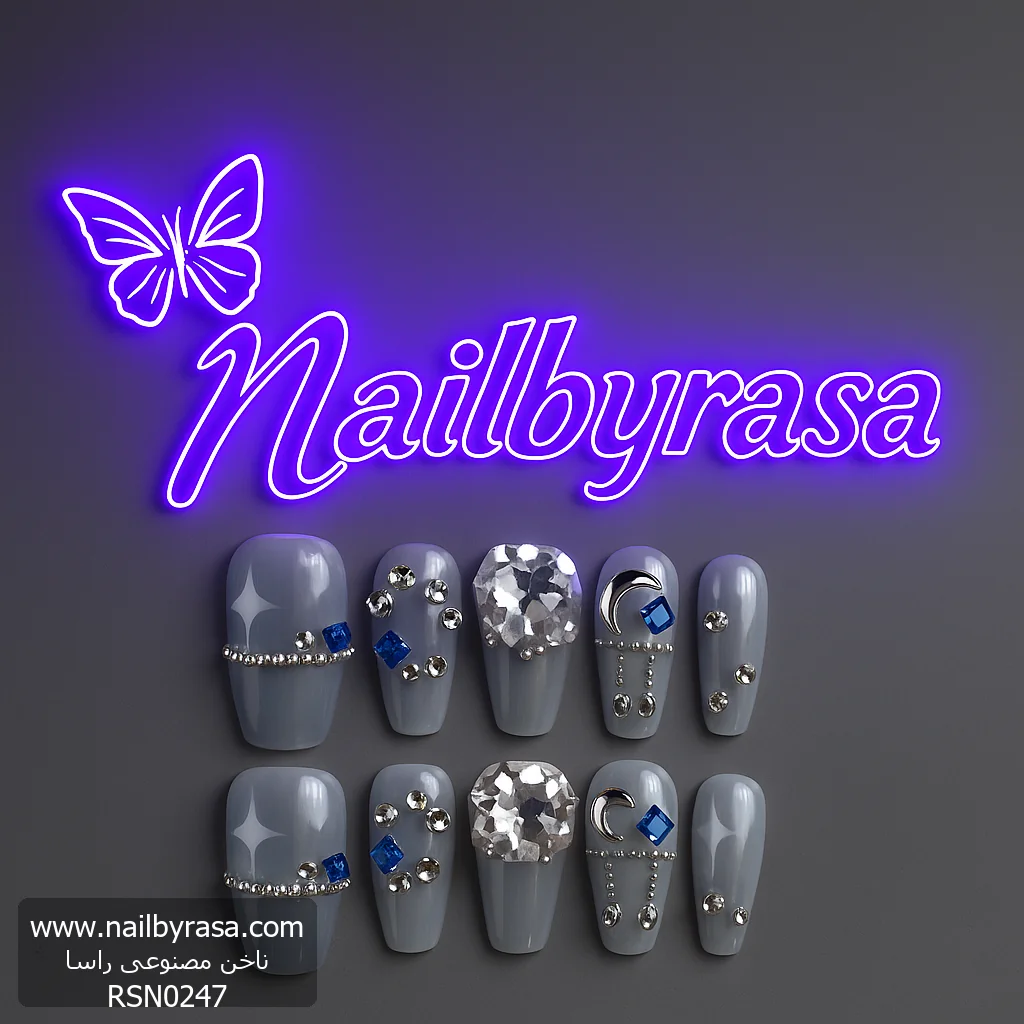ناخن مصنوعی راسا مدل آبی بیبی شیری طرح نگین دار ستاره ای کد RSR832