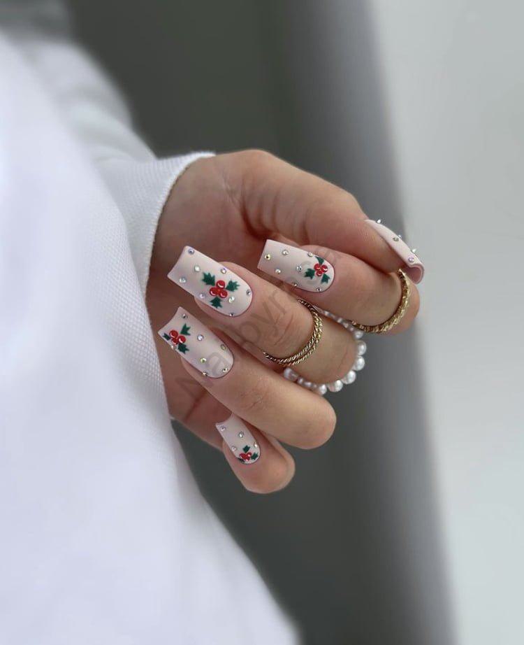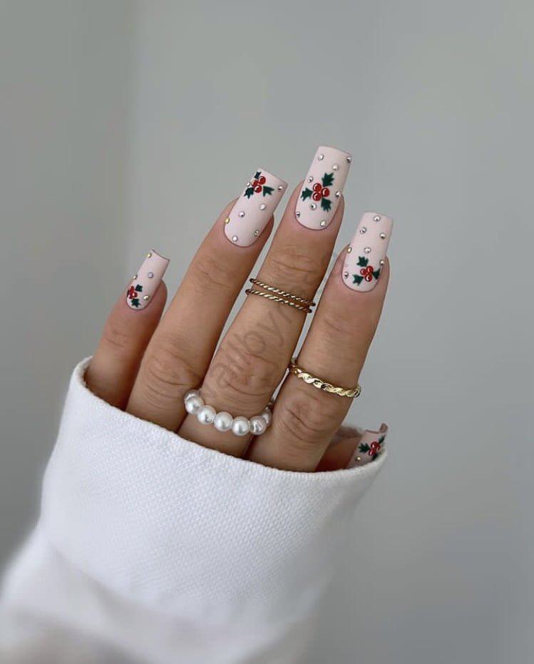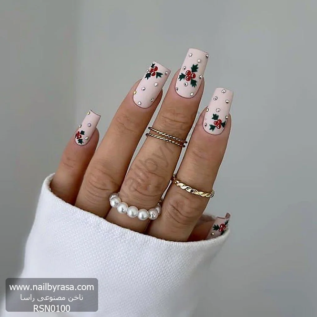 - گل راعی (Holly Berries): نقاشیهای ظریف از برگهای سبز و میوههای قرمز کوچک که نماد اصلی کریسمس هستند، با دقت بالا روی ناخنها اجرا شدهاند (دسته ناخن مصنوعی طرح دار).