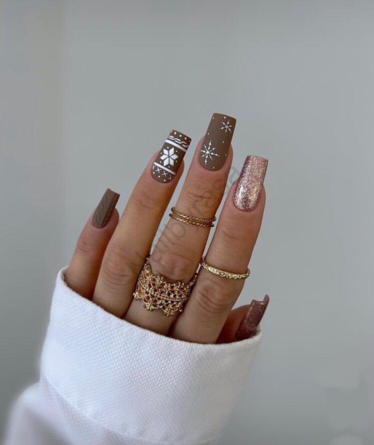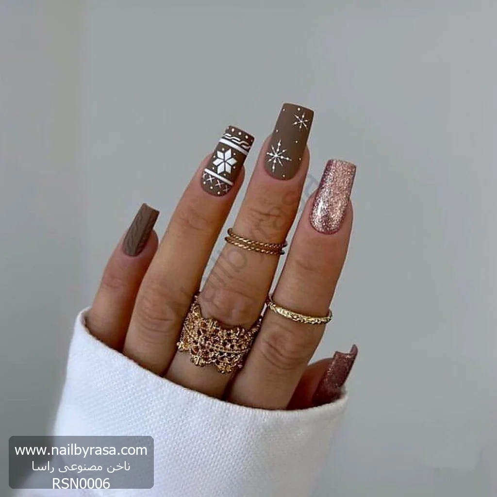 این مدل دقیقاً برای ست کردن با پالتوهای شتری، لباسهای بافتنی کرم/قهوهای و بوتهای چرم ساخته شده است. اگر میخواهید در عکسهای زمستانی یا مهمانیهای کریسمس، ناخنهایتان نقطه قوت استایلتان باشد، این مدل بهترین انتخاب از کالکشن ناخن مصنوعی زمستانی است.
