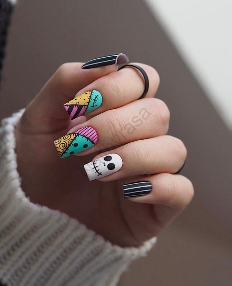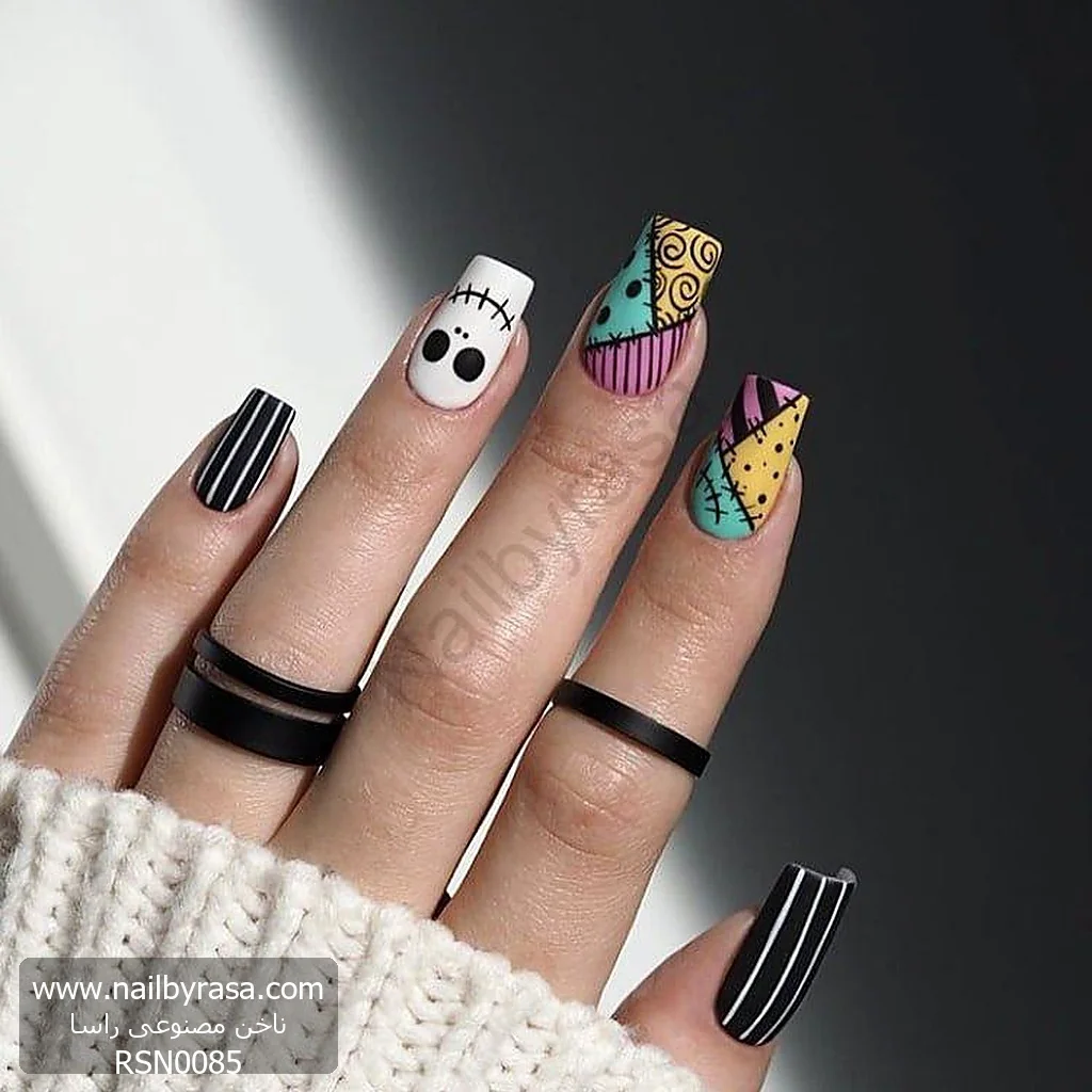 - لباس سالی (Sally’s Patchwork): روی دو ناخن، پترن چهلتکه و بخیهخوردهی لباس سالی با رنگهای زرد، فیروزهای و صورتی اجرا شده که کنتراست زیبایی با رنگهای تیره دارد (مشاهده ناخن مصنوعی فانتزی).