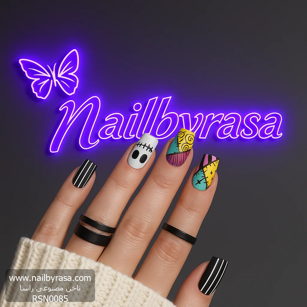 برای طرفداران دنیای فانتزی و کمی ترسناک تیم برتون، هیچ چیز جذابتر از داشتن ناخنهایی با طرح “Jack & Sally” نیست. ناخن مصنوعی راسا مدل RSN0085 یک ادای احترام هنری به انیمیشن “Nightmare Before Christmas” است که با جزئیات دقیق نقاشی شده است.