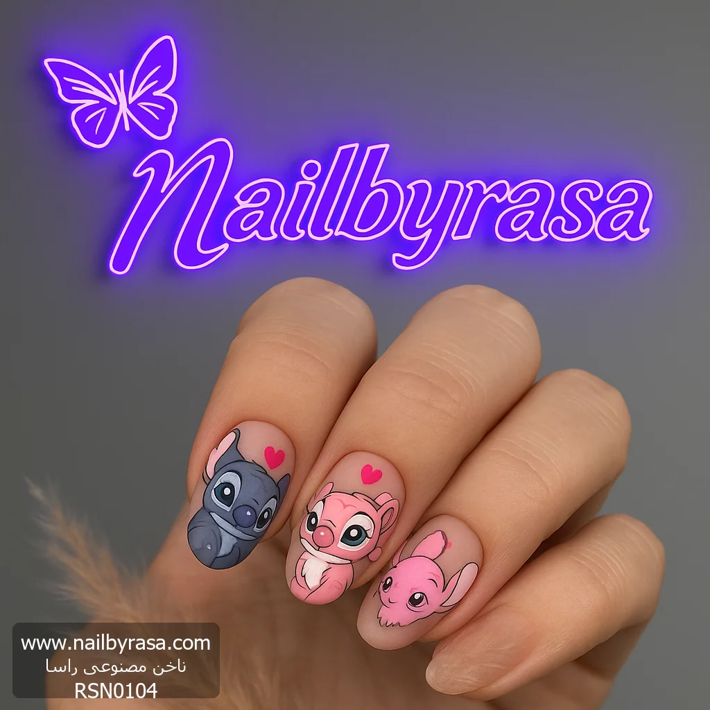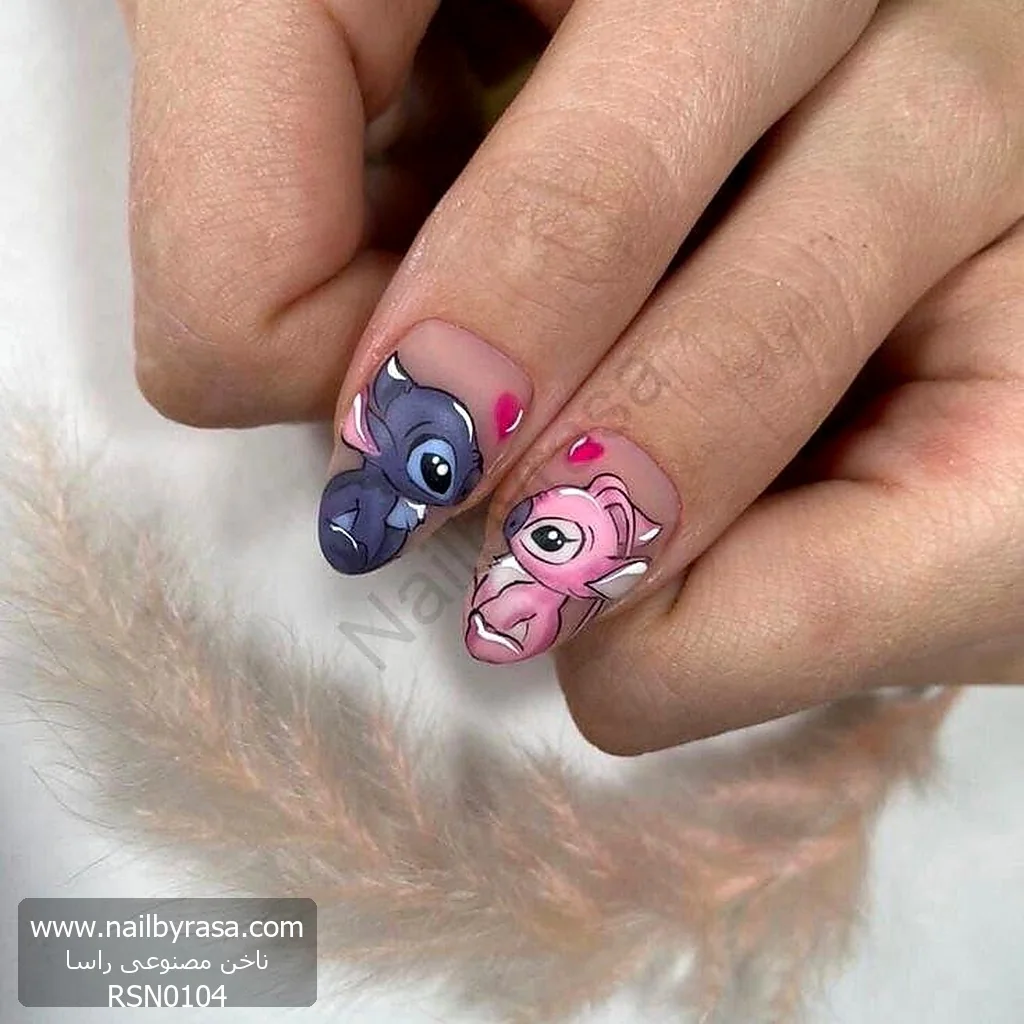 - نقاشی کاپلی (Couple Art): کشیدن چهرهی استیچ روی یک ناخن و آنجل روی ناخن کناری، این ست را به یک انتخاب فوقالعاده برای روز ولنتاین، سالگردها یا صرفاً نشان دادن روحیه لطیف و رمانتیک شما تبدیل کرده است (دسته ناخن مصنوعی فانتزی و کارتونی).
