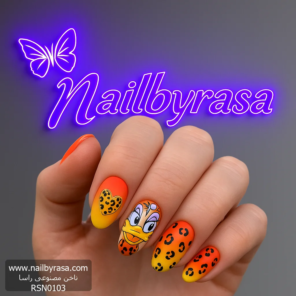 - دیزی داکِ فشن: نقاشی چهرهی کاراکتر محبوب “دیزی داک” با پاپیون پلنگی، این ست را برای عاشقان انیمیشن و استایلهای تینجری به یک انتخاب بیرقیب تبدیل کرده است (دسته ناخن مصنوعی فانتزی و کارتونی).