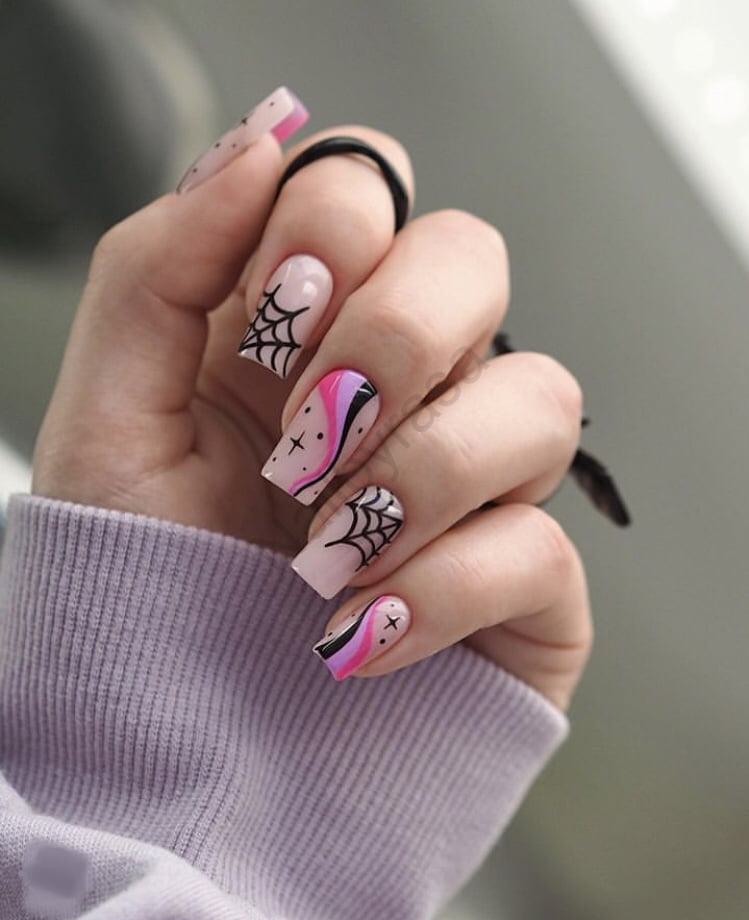 - تار عنکبوت گرافیکی: روی دو ناخن، طرح تار عنکبوت با خطوط ظریف مشکی روی بیس نود کشیده شده که نماد اصلی این ست است (دسته ناخن مصنوعی عنکبوتی).