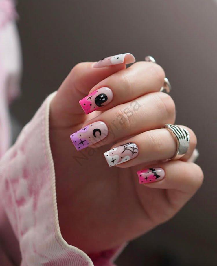 - نمادهای شبانه: طراحی ماه هلال، خفاش، روح و تار عنکبوت در کنار ستارههای ریز مشکی، حال و هوای یک شب جادویی و فانتزی را تداعی میکند (دسته ناخن مصنوعی فانتزی).