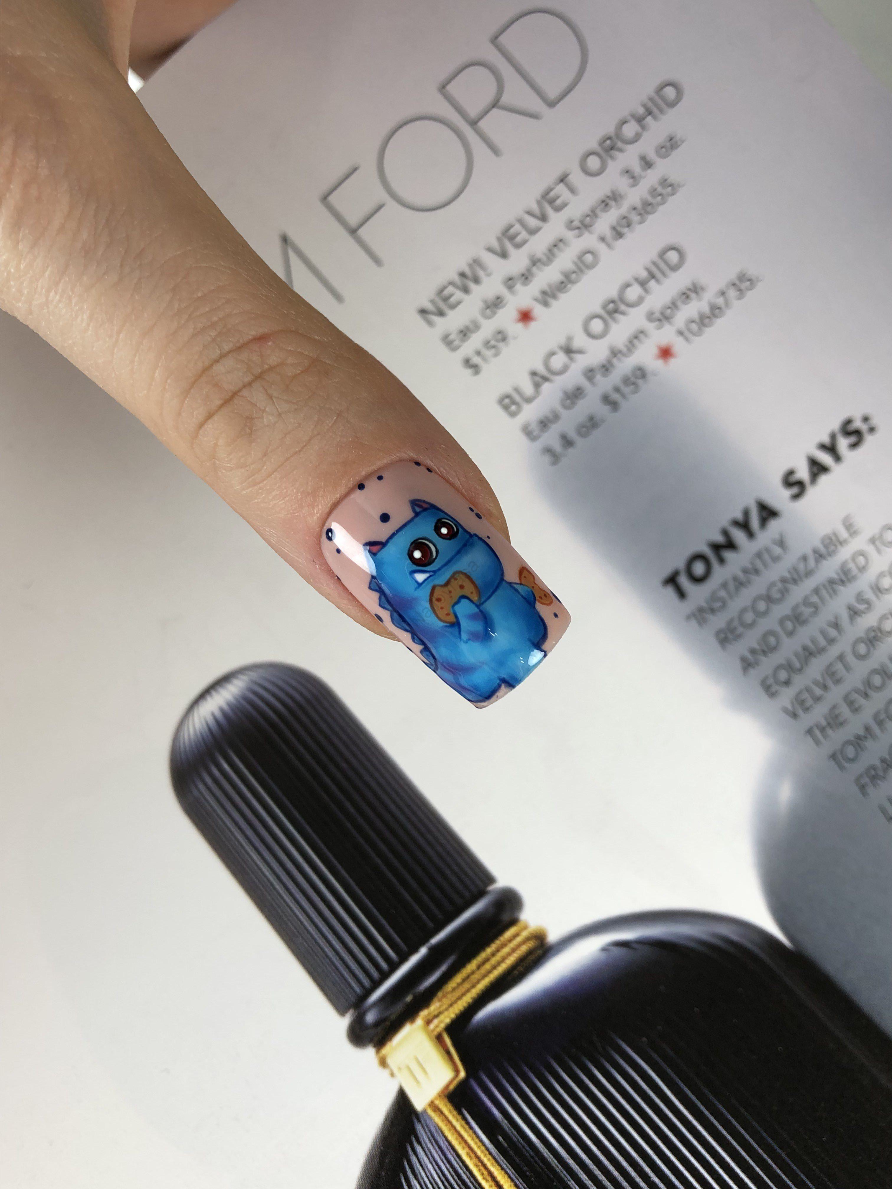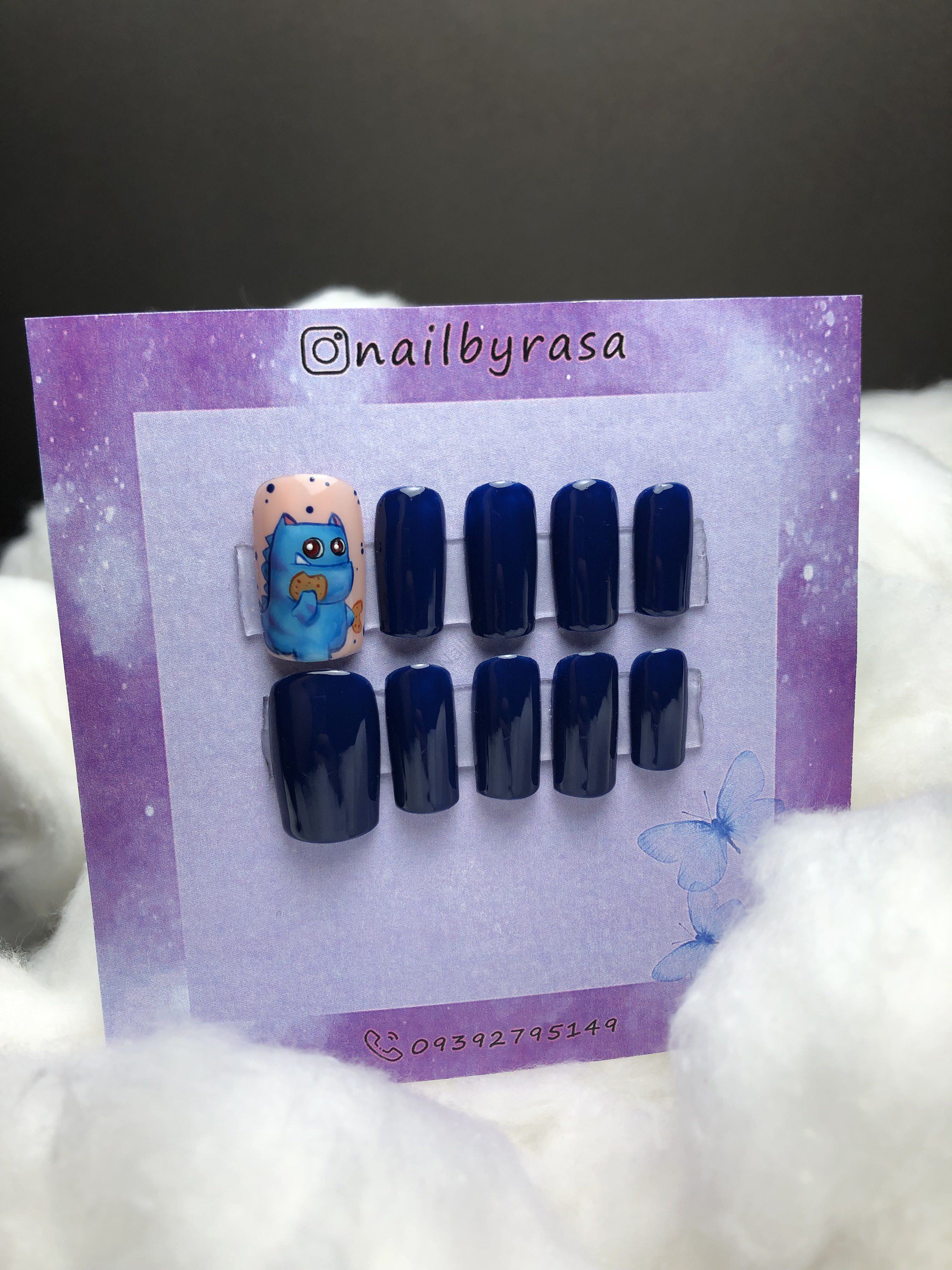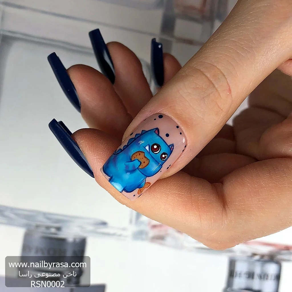 - نقاشی دستساز (Hand-Painted): روی ناخن شست، چهره بامزه سالیوان با جزئیات دقیق و در حال خوردن کوکی طراحی شده است. این سبک طراحی در دسته ناخن مصنوعی کارتنی و ناخن مصنوعی انیمیشنی قرار میگیرد که ترند محبوب نوجوانان است.