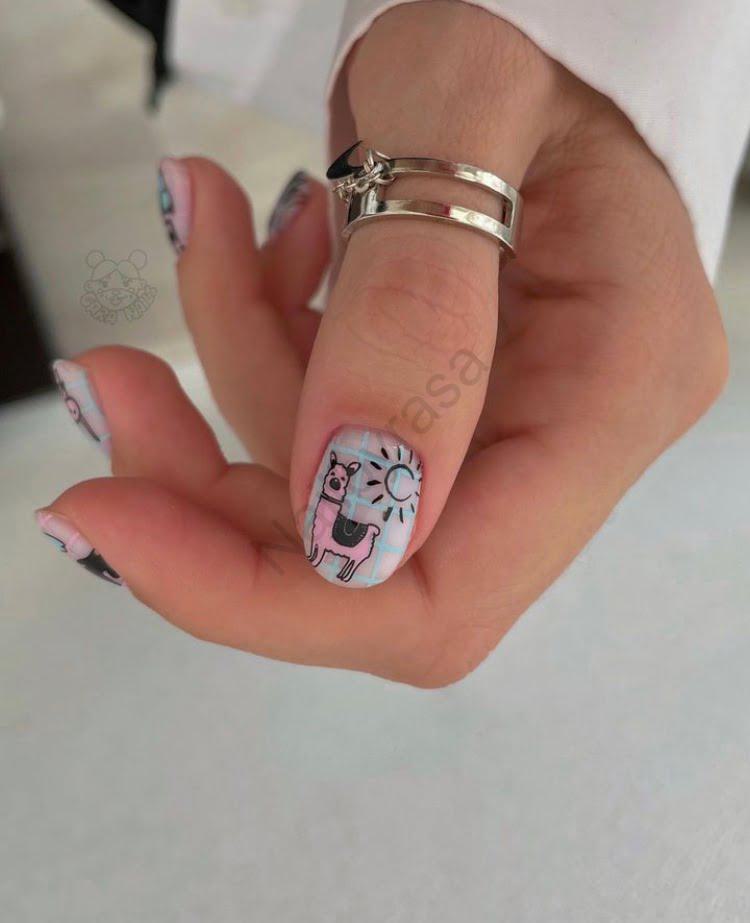 - رنگهای پاستلی: استفاده از بیس صورتی بسیار روشن در کنار آبی نوزادی، ترکیبی آرامبخش و در عین حال شاد ایجاد کرده است (مشاهده ناخن مصنوعی صورتی).