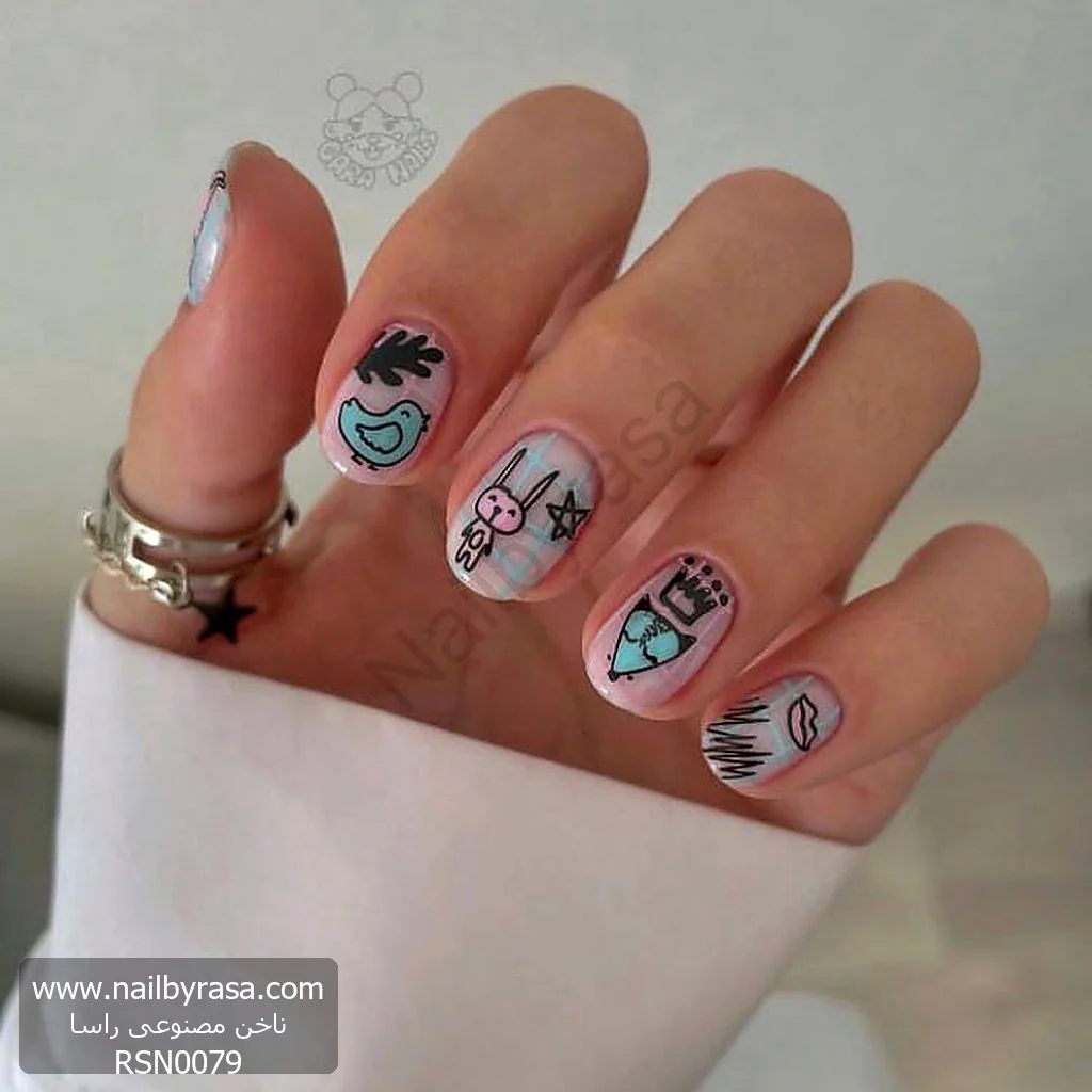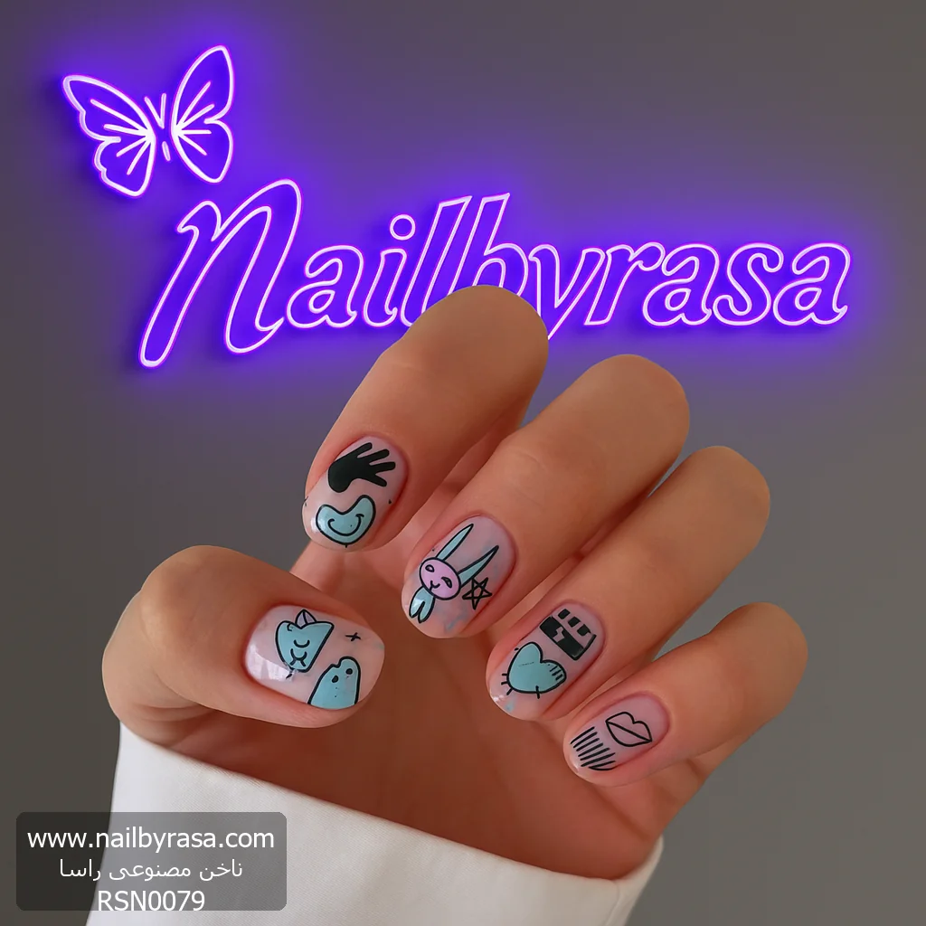 آیا به دنبال ناخنهایی هستید که هر بار به آنها نگاه میکنید، لبخند روی لبتان بیاورد؟ ناخن مصنوعی راسا مدل RSN0079 دقیقاً همین کار را میکند! این ست با الهام از نقاشیهای سریع و فانتزی (Doodle) و استیکرهای محبوب نوجوانان، یک استایل “Indie” و جوانپسند خلق کرده است.