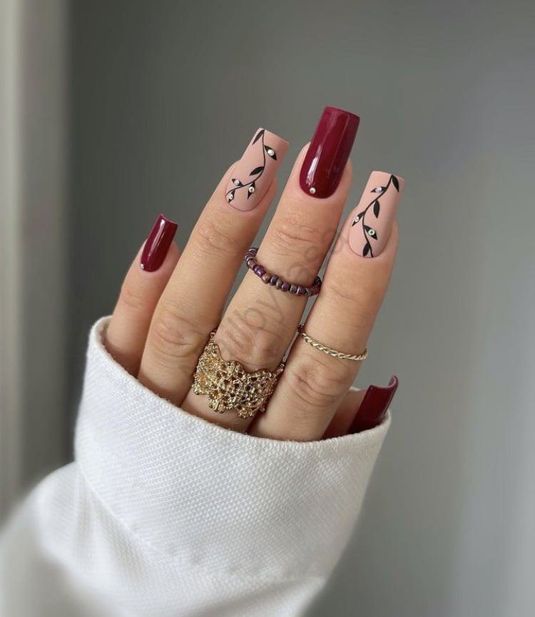 - بازی مات و براق: تضاد بین ناخنهای زرشکیِ براق و ناخنهای نودِ مات، به ست عمق داده و نشاندهنده طراحی مدرن آن است (لینک به ناخن مصنوعی قرمز/زرشکی).