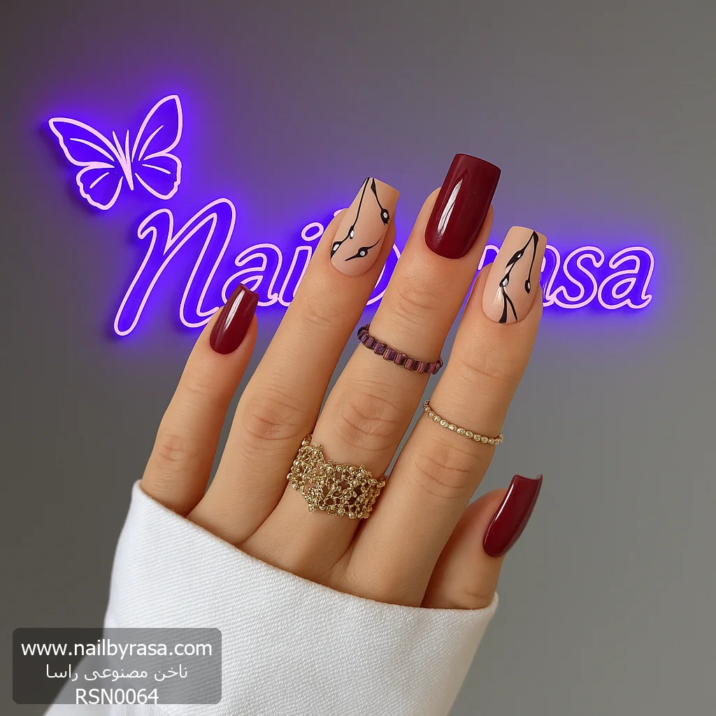 رنگ زرشکی همیشه نماد وقار و زنانگی بوده است. ناخن مصنوعی راسا مدل RSN0064 با استفاده از این رنگ جاودانه و ترکیب آن با طرحهای مینیمال گیاهی، مدلی را خلق کرده که هرگز قدیمی نمیشود و برای خانمهایی با سلیقه کلاسیک و شیکپسند ایدهآل است.