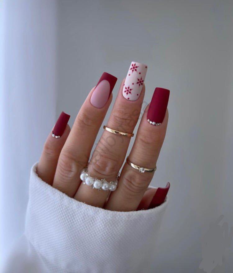 - برفهای زرشکی: برخلاف طرحهای معمول که برف سفید است، در این مدل از رنگ قرمز روی زمینه روشن استفاده شده که کنتراست فوقالعادهای دارد و بسیار خاص است (دسته ناخن مصنوعی طرح دار).