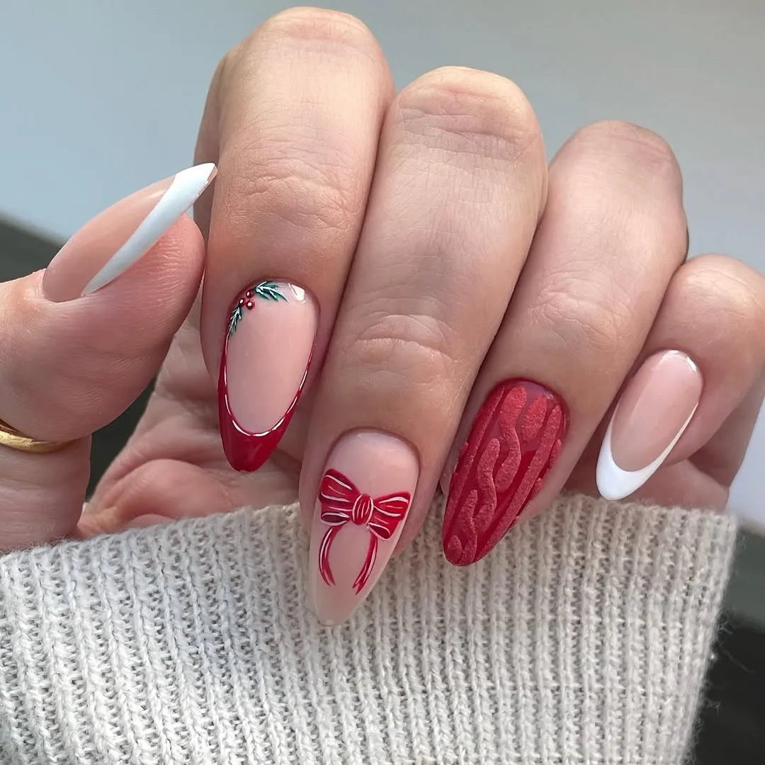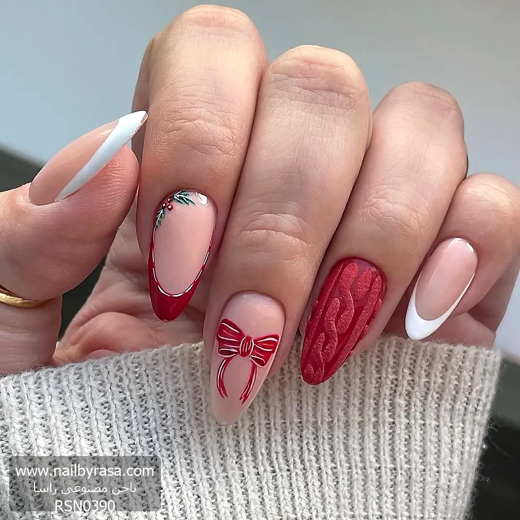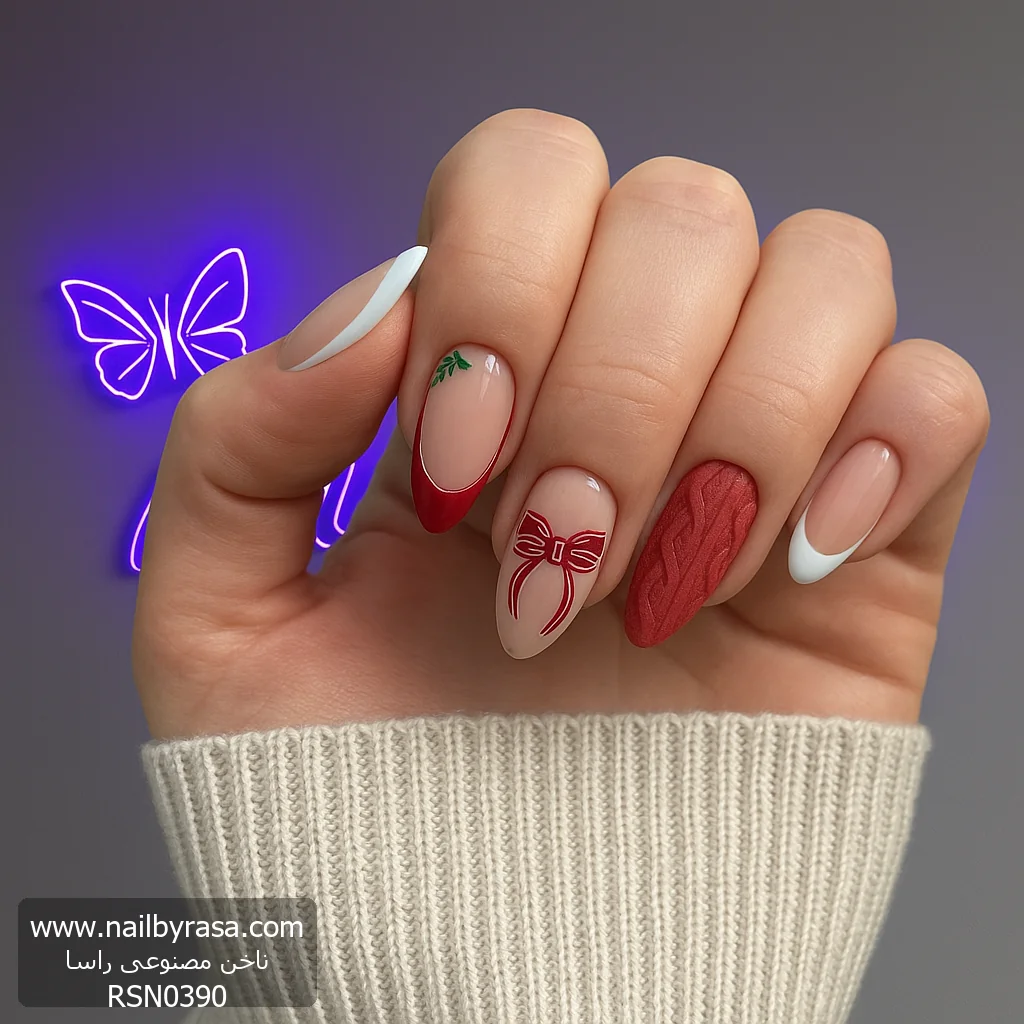 ناخن مصنوعی راسا مدل زمستانی رنگ قرمز طرح پاپیون فرم بادامی کد RSH18