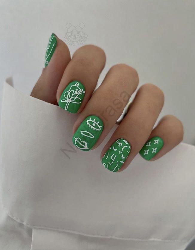 - لاین آرت (Line Art): طرحهای خطی سفید روی زمینه سبز، شامل چهرههای انتزاعی، چشم و المانهای دکوراتیو است که یادآور آثار “ماتیس” و نقاشیهای تکخطی مدرن است (دسته ناخن مصنوعی خطی/مینیمال).