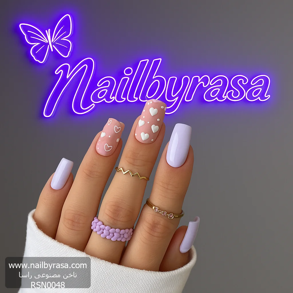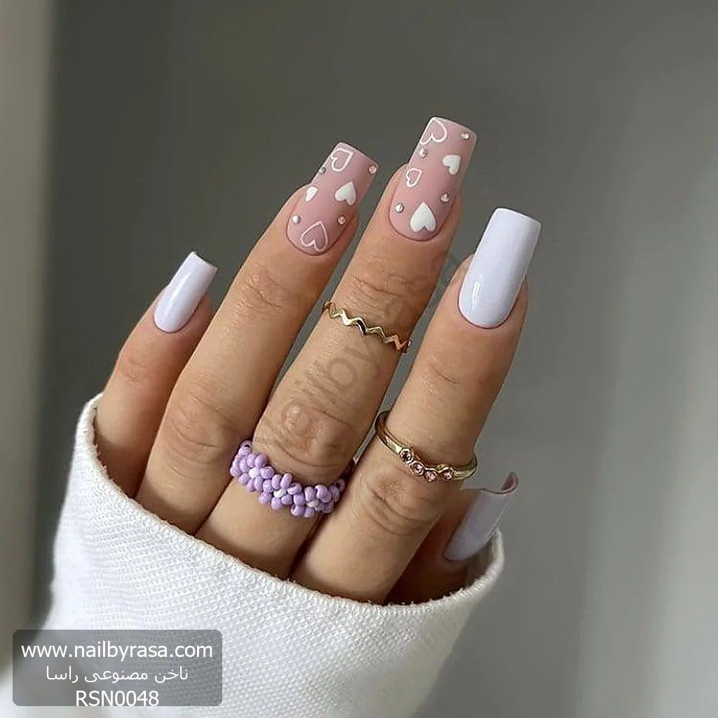 برای روزهای پر از عشق یا زمانی که میخواهید حس دخترانه و لطیف خود را نشان دهید، ناخن مصنوعی راسا مدل RSN0048 انتخابی بینظیر است. این مدل با ترکیب رنگ صورتی محبوب و طرح قلبهای پراکنده، ظاهری رویایی و “Dreamy” دارد.