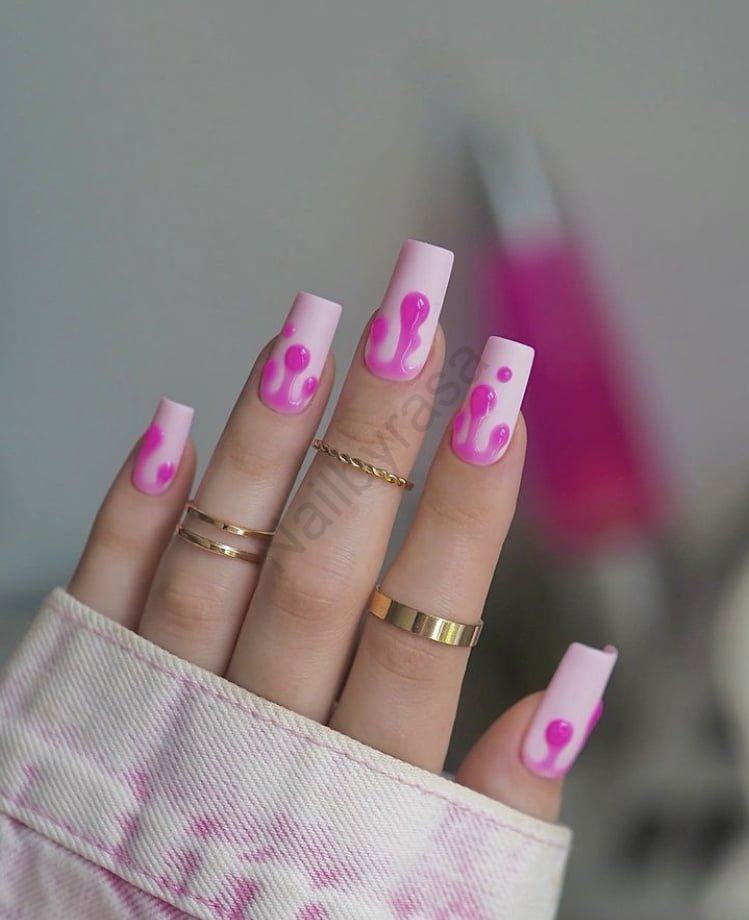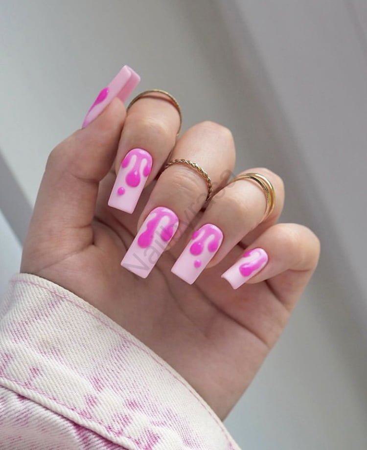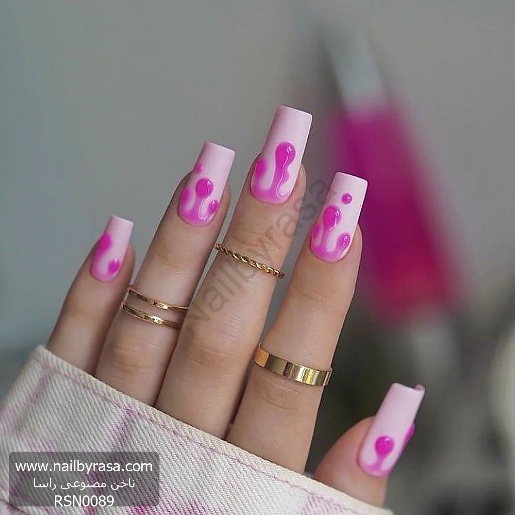 - افکت حباب مایع (Liquid Swirls): اشکال قطرهای و منحنی که با سایهزنی حرفهای، حالتی برجسته و شناور پیدا کردهاند. ترکیب رنگ صورتی جیغ با سایههای بنفش، عمق فوقالعادهای به طرح داده است (دسته ناخن مصنوعی فانتزی).