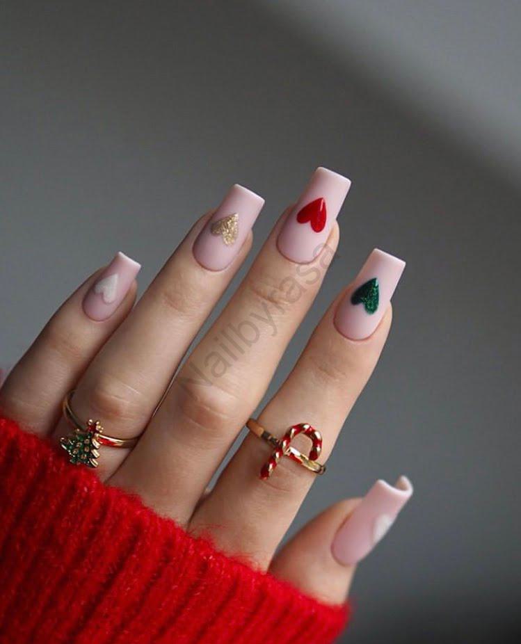 - تنوع بافتها: قلب قرمز حالتی براق و ژلی دارد، در حالی که قلبهای سبز و طلایی با اکلیل (Glitter) میدرخشند و قلب سفید بافتی مات و برفی دارد. این بازی با بافتها روی زمینه مات، نشاندهنده کیفیت بالای طراحی است (مشاهده ناخن مصنوعی طرح دار).