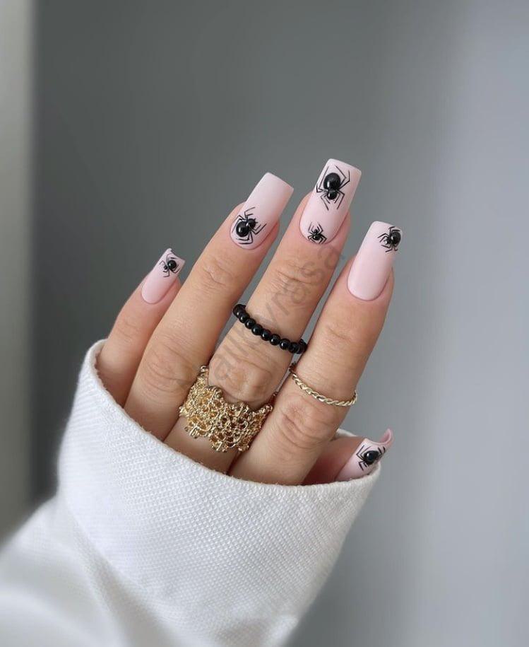 - تضاد مات و براق: زمینه صورتی پاستلی کاملاً مات است تا براقیت عنکبوتها بیشتر به چشم بیاید. این کنتراست بافت، نشاندهنده کیفیت بالای طراحی است (لینک به ناخن مصنوعی مات).