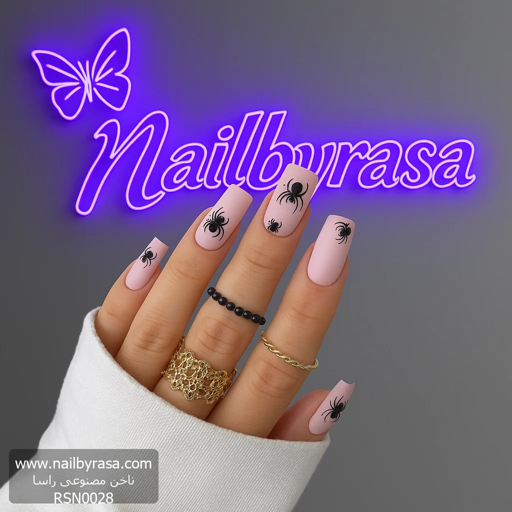 اگر فکر میکنید طرحهای هالووین یا گوتیک حتماً باید تیره و خشن باشند، ناخن مصنوعی راسا مدل RSN0028 نظر شما را عوض میکند. این مدل با ترکیب رنگ صورتی معصومانه و طرح عنکبوتهای سیاه، سبکی به نام “Spooky Cute” را خلق کرده که هم بامزه است و هم هیجانانگیز.