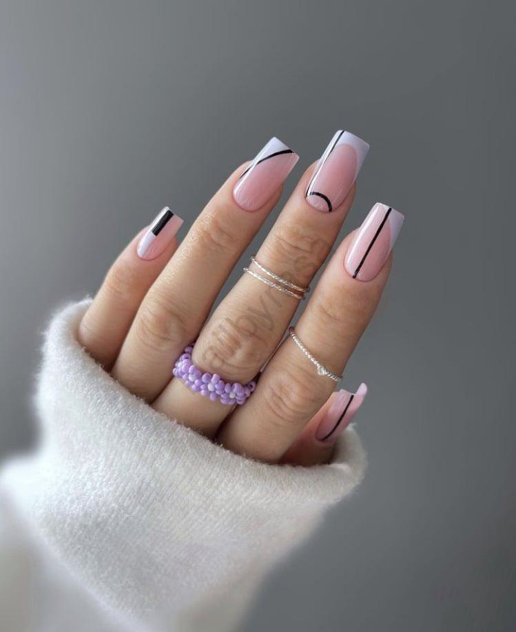 - خطوط گرافیکی مشکی: خطوط نازک و دقیق مشکی، مثل یک قاببندی هنری عمل میکنند و به طرح عمق میدهند. تضاد سفید و مشکی همیشه نشانه شیکپوشی است (مشاهده ناخن مصنوعی سیاه سفید).