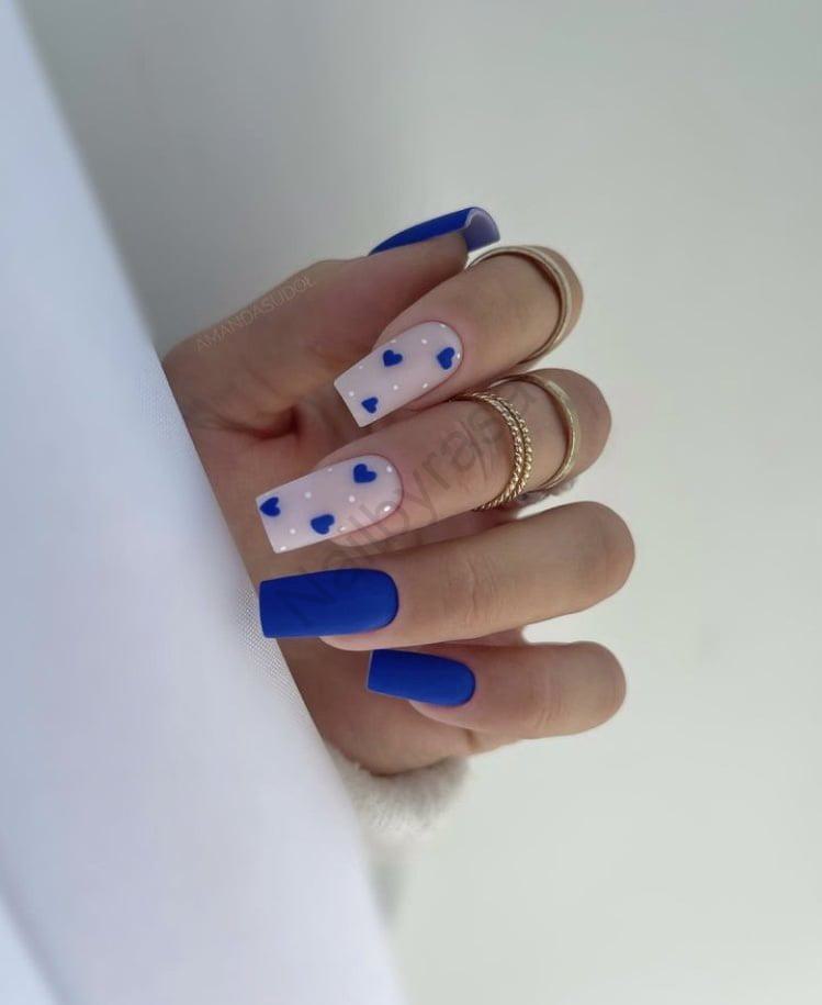 - پترن قلب و خال: روی بیس نود، قلبهای کوچک آبی و خالهای سفید کار شده است. این سبک طراحی در دسته ناخن مصنوعی فانتزی و طرحدار قرار میگیرد و حس جوانی و شادابی دارد.