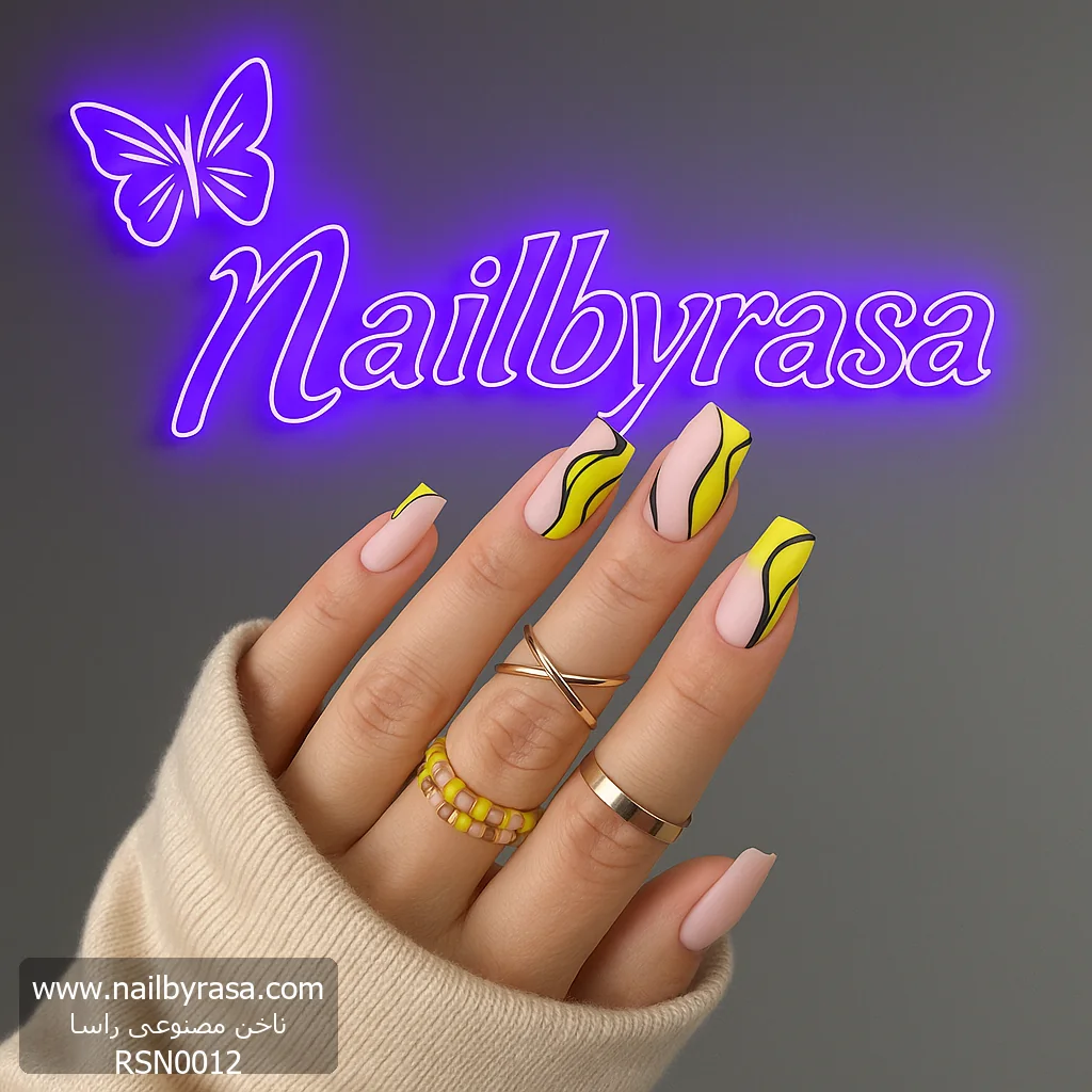 - لاین آرت مشکی: خطوط باریک مشکی دور لکههای رنگی، مثل یک قلمگیری گرافیکی عمل میکنند و باعث میشوند رنگ زرد بیشتر به چشم بیاید (Pop کند). این سبک در دسته ناخن مصنوعی خطی قرار میگیرد.