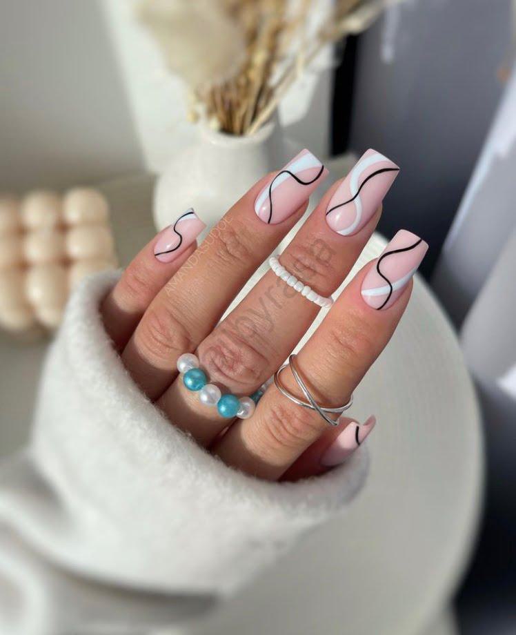 - خطوط مواج (Swirls): حرکت نرم خطوط مورب روی ناخن، خشکی فرم مربعی را متعادل کرده است. این سبک طراحی در دسته ناخن مصنوعی مینیمال و ناخن مصنوعی خطی قرار میگیرد که نماد سادگی و شیکپوشی است.