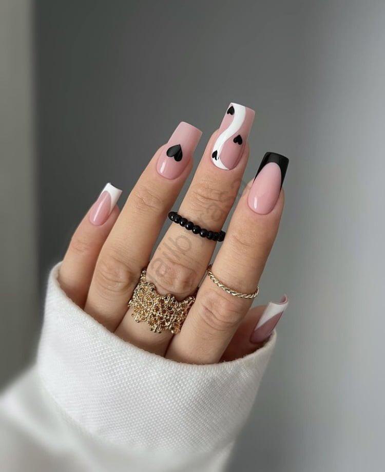 - قلب تک: روی انگشت وسط، یک قلب مشکی در مرکز ناخن قرار دارد که نماد مینیمالیسم عاشقانه است.