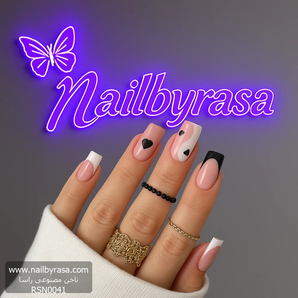 طرحهای قلبی همیشه محبوب هستند، اما وقتی با رنگ مشکی اجرا شوند، تبدیل به یک استایل “کول” و امروزی میشوند. ناخن مصنوعی راسا مدل RSN0041 با ترکیب پترنهای مختلف در یک ست، ظاهری پویا و غیرتکراری به دستان شما میدهد.