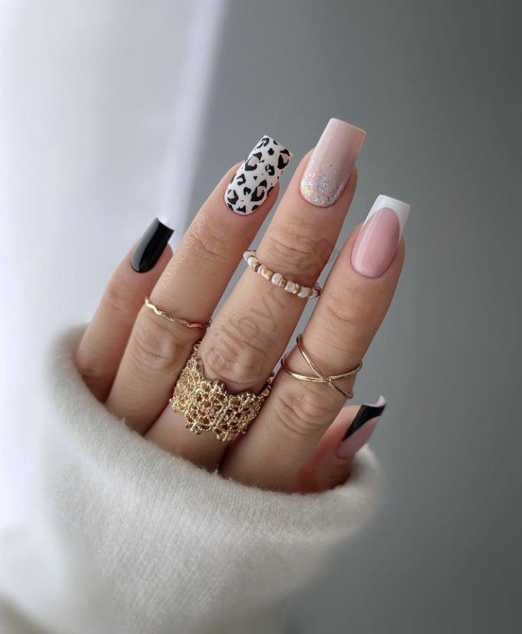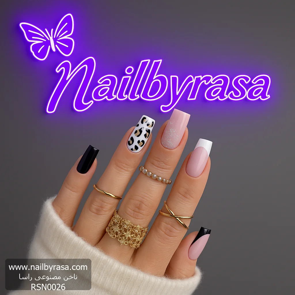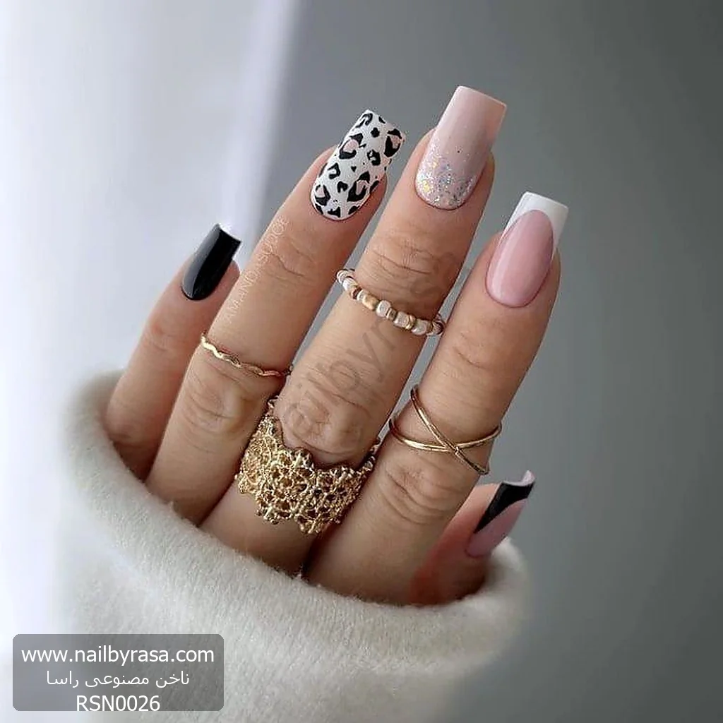 - پلنگی و مشکی: ترکیب طرح پلنگی (Leopard) با ناخن مشکی یکدست، بخش جسورانه و فشن این ست است (مشاهده ناخن مصنوعی طرح دار و ناخن مصنوعی مشکی).