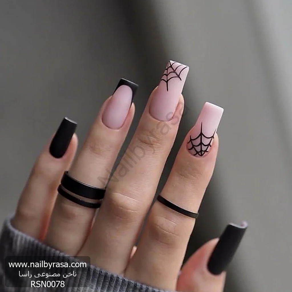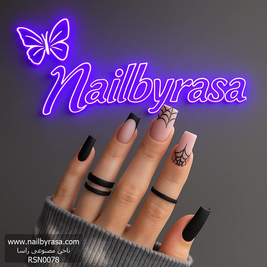 چه برای جشن هالووین آماده شوید و چه طرفدار همیشگی استایلهای “دارک” و گوتیک باشید، ناخن مصنوعی راسا مدل RSN0078 انتخابی بینظیر است. این مدل ثابت میکند که طرحهای هالووین میتوانند به جای شلوغ بودن، بسیار مینیمال، تمیز و بزرگسالانه باشند.