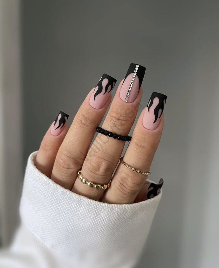- شعلههای وایرال (Viral Flames): طرح آتش یکی از محبوبترین ترندهای تیکتاک و اینستاگرام در سالهای اخیر است. اجرای این طرح با رنگ مشکی روی بیس مات، حالتی مرموز و “Bad Girl” دارد (دسته ناخن مصنوعی اسپرت).