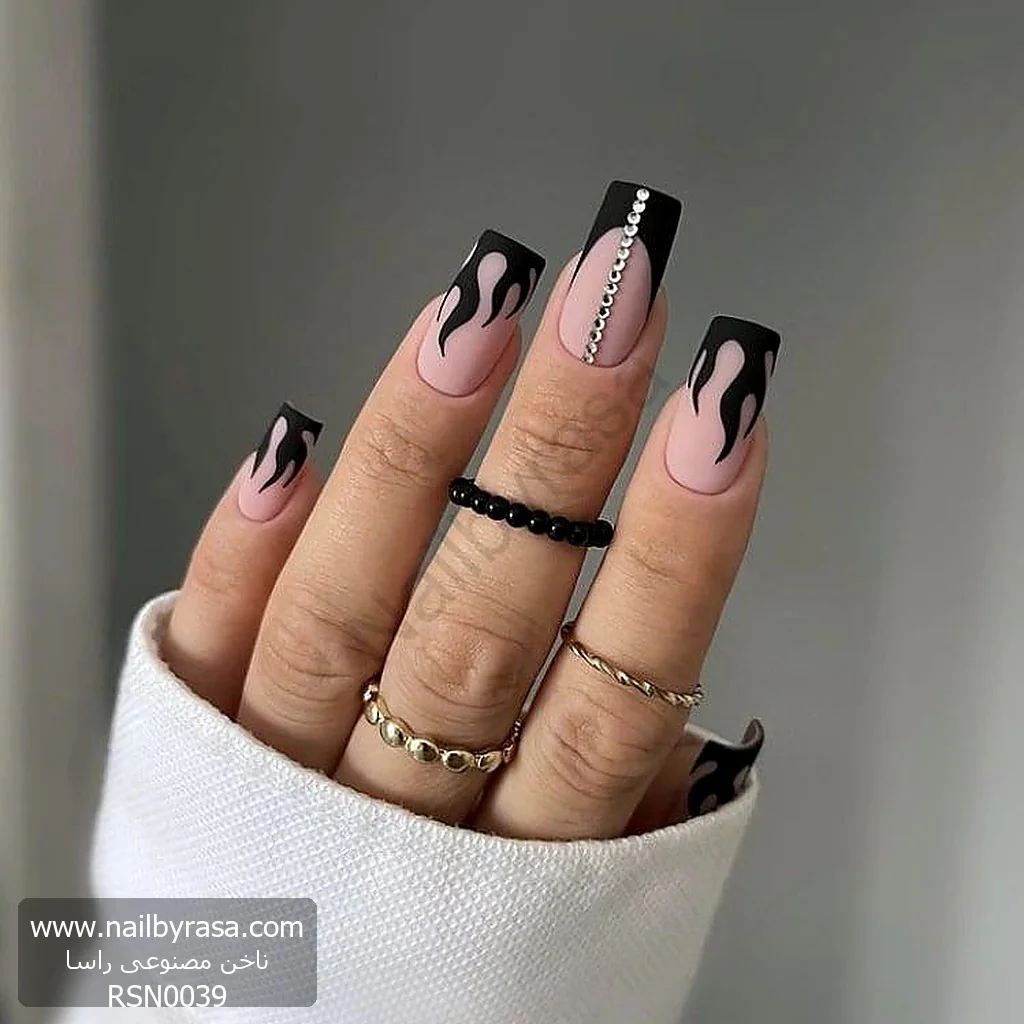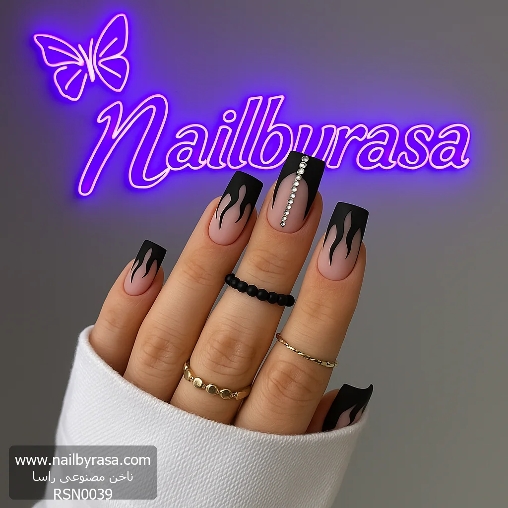 اگر به دنبال ناخنی هستید که تمام نگاهها را در مهمانی به خود جلب کند، ناخن مصنوعی راسا مدل RSN0039 انتخاب نهایی شماست. این مدل با ترکیب “خشونت” طرح آتش و “ظرافت” جواهرات، یک پارادوکس بصری فوقالعاده ایجاد کرده که دقیقاً مناسب دختران جسور و خوشسلیقه است.