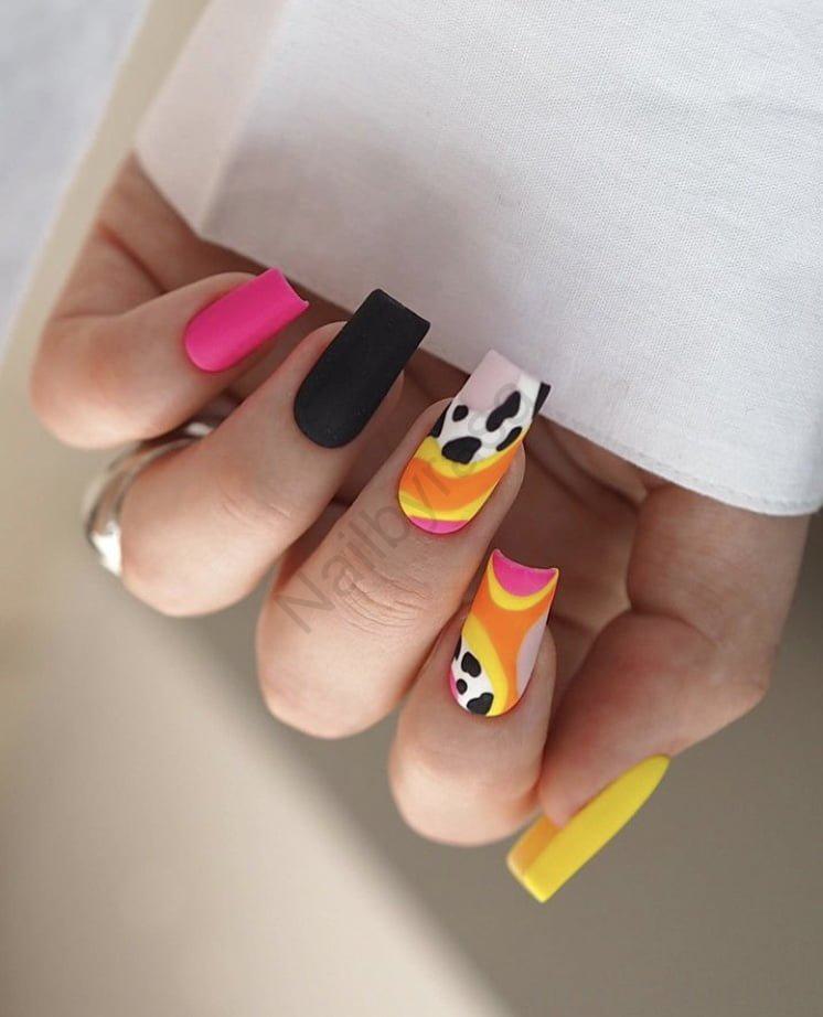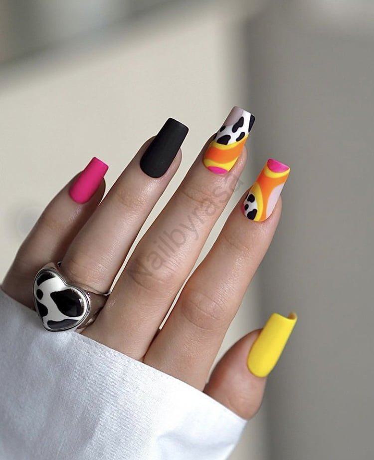 - تکرنگهای مات: استفاده از ناخنهای کاملاً مشکی، زرد و صورتی در بین طرحها، باعث ایجاد تعادل شده و پالت رنگی را کامل کرده است (لینک به ناخن مصنوعی مات).