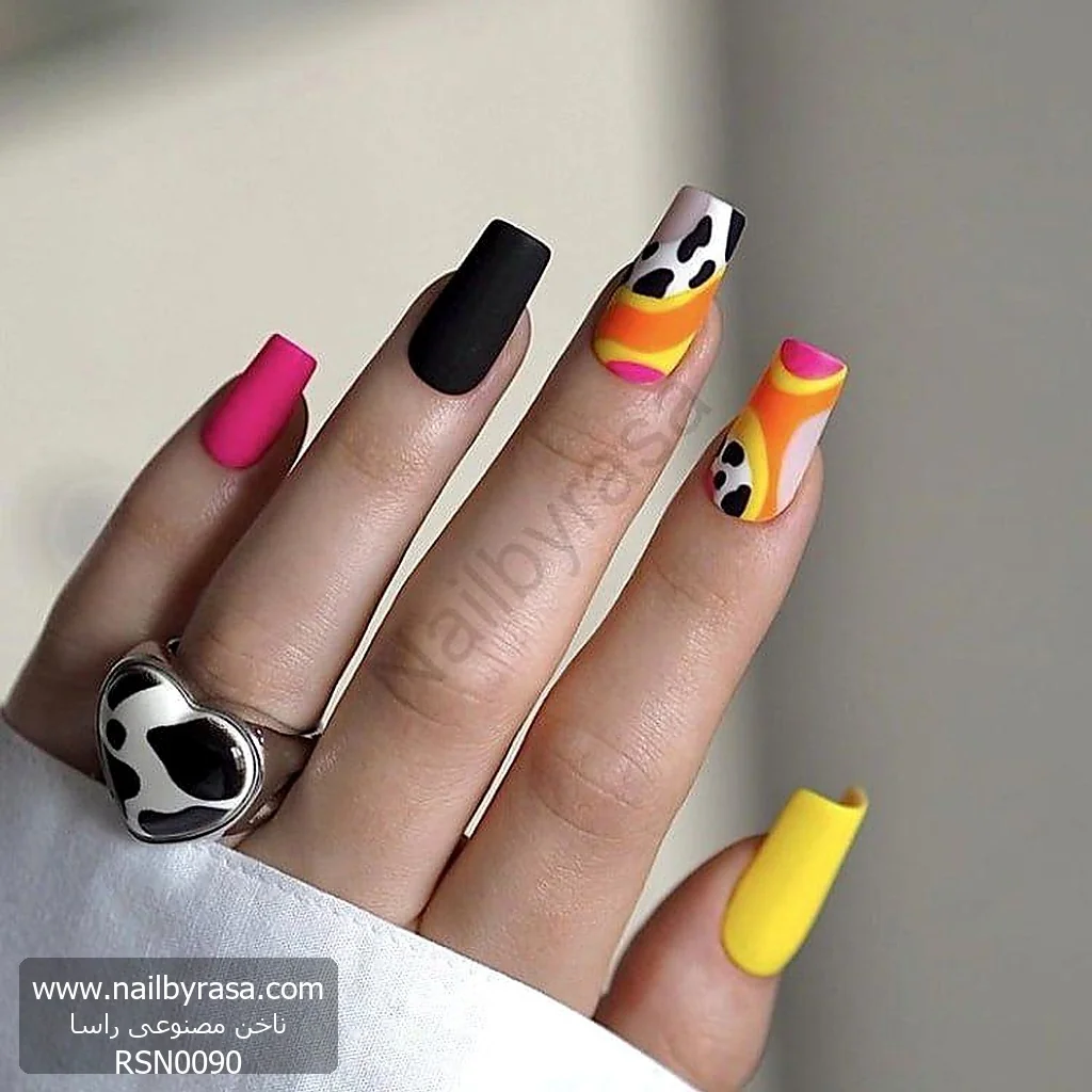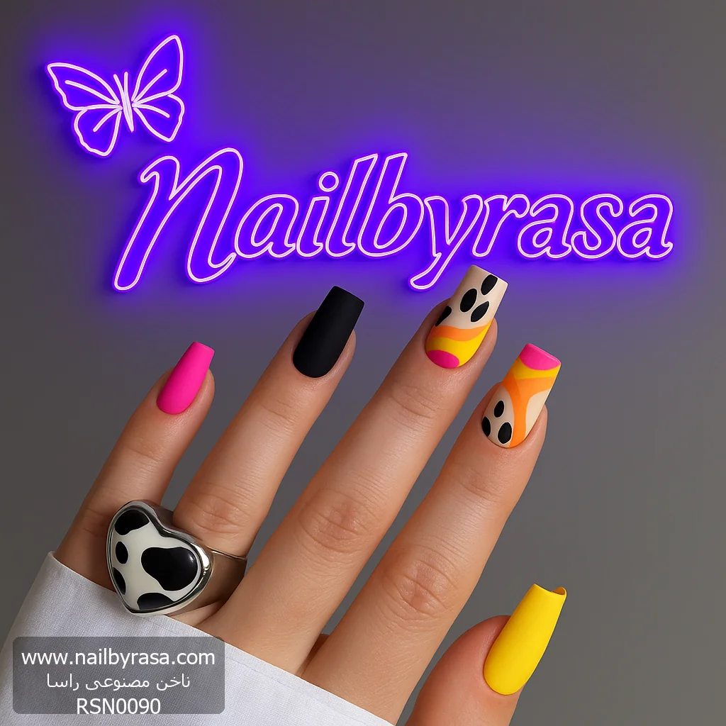 اگر عاشق استایلهای رنگیرنگی، هنری و کمی عجیب (Quirky) هستید، ناخن مصنوعی راسا مدل RSN0090 دقیقاً برای شماست. این ست با الهام از پوسترهای سایکدلیک دهه ۷۰ و ترکیب آن با ترند حیوانات، یک بمب انرژی است.