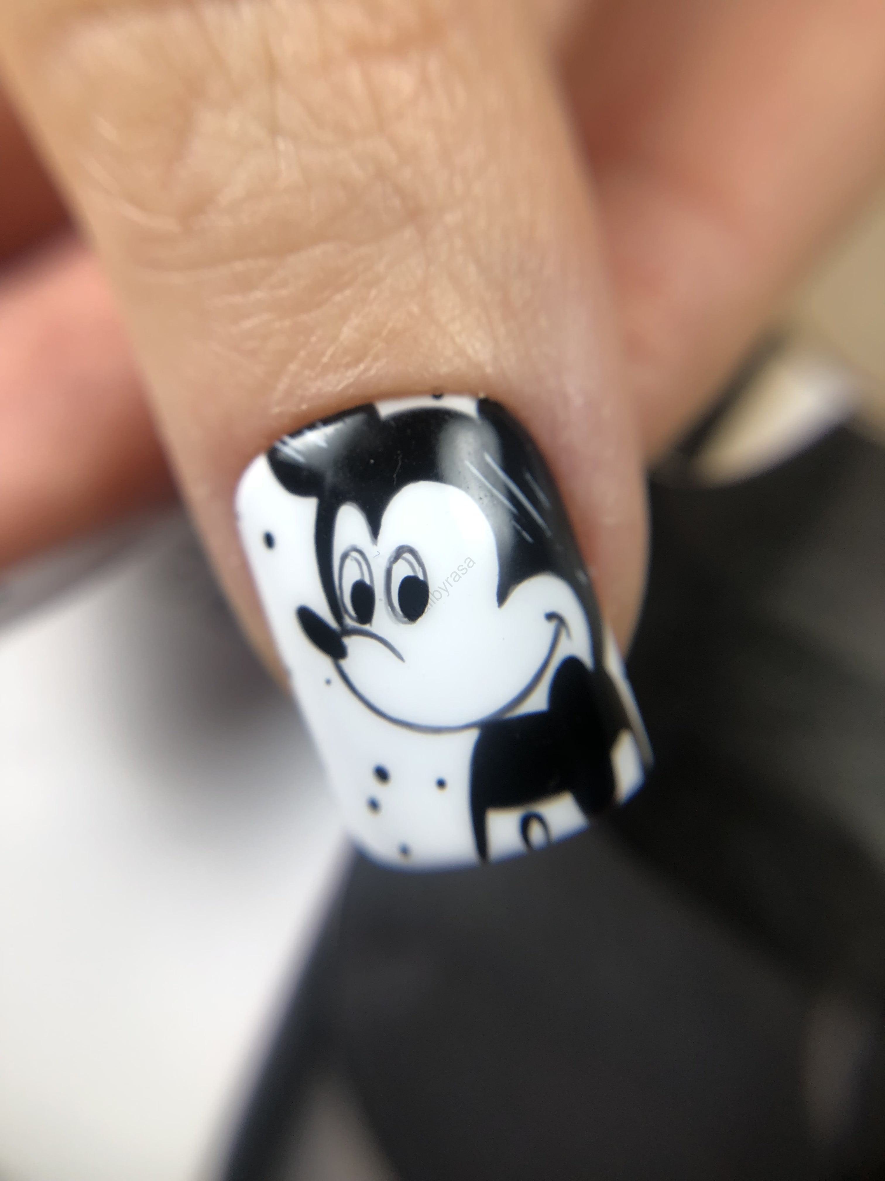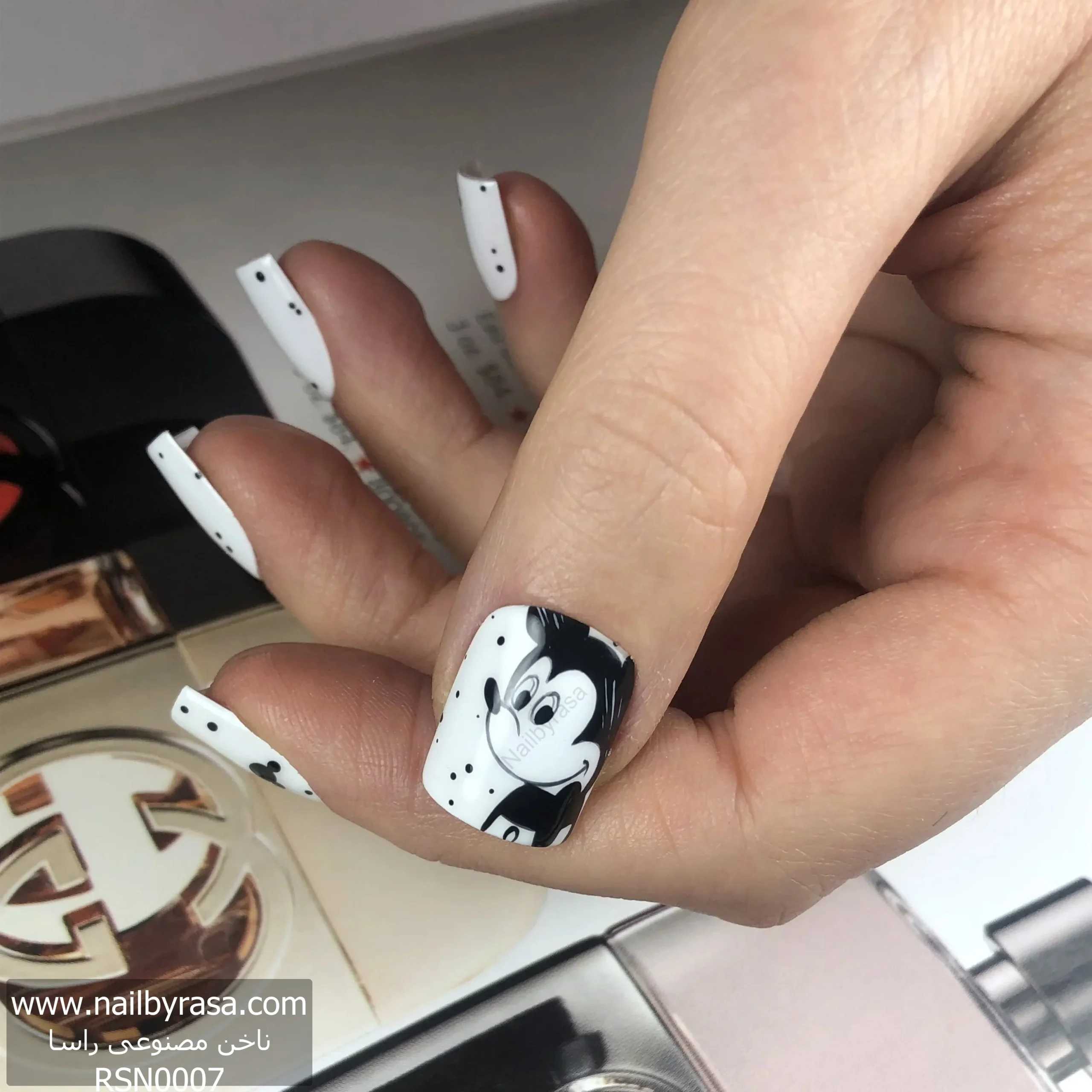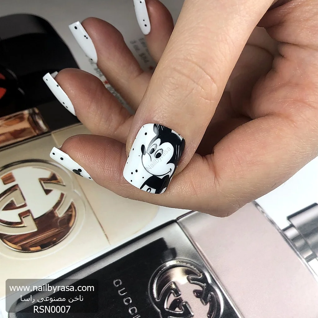 - میکی موس دستساز: روی ناخن شست، چهره میکی موس با جزئیات دقیق طراحی شده است. این سبک طراحی در دسته پرطرفدار ناخن مصنوعی کارتنی و ناخن مصنوعی انیمیشنی قرار میگیرد.