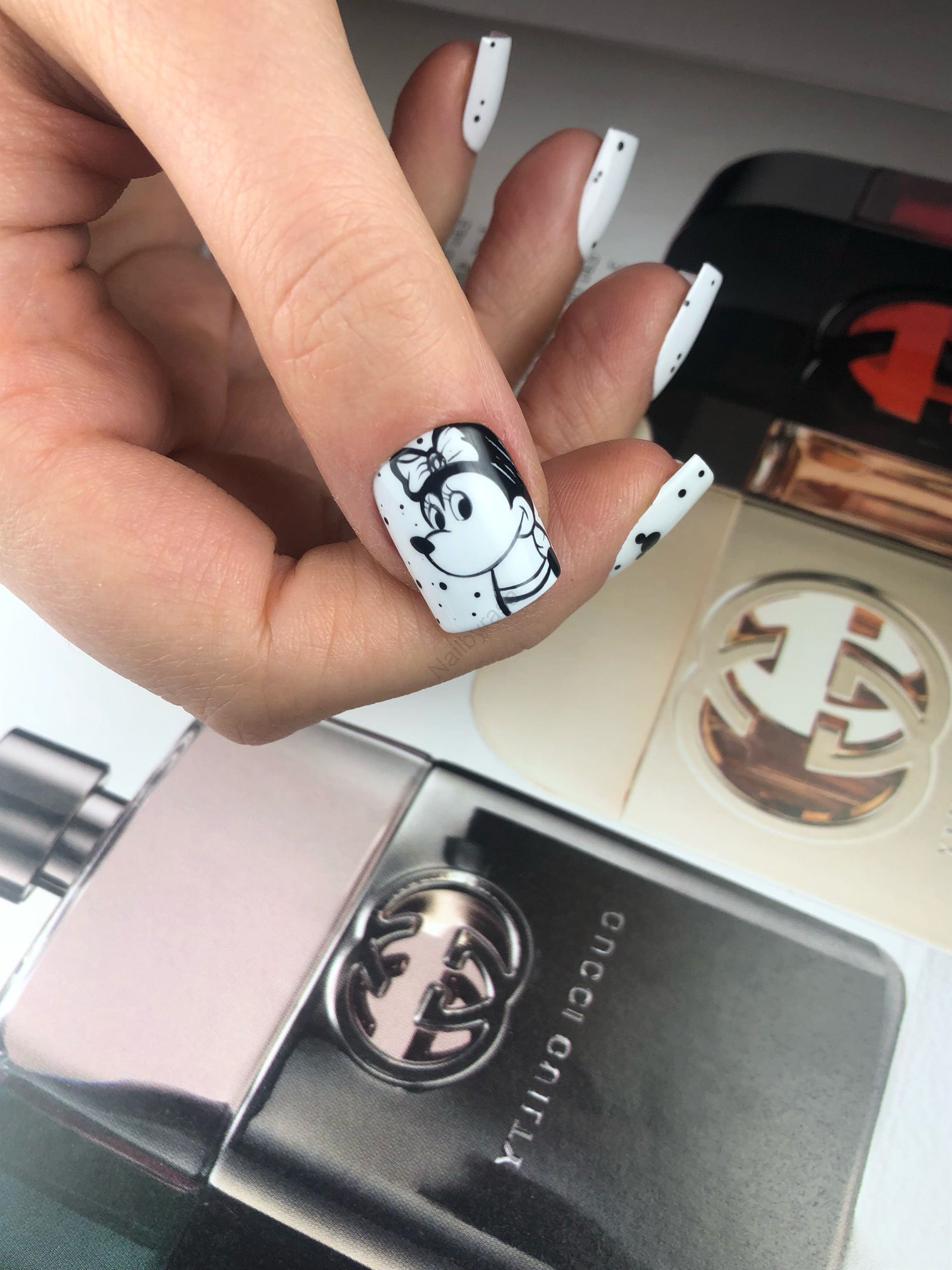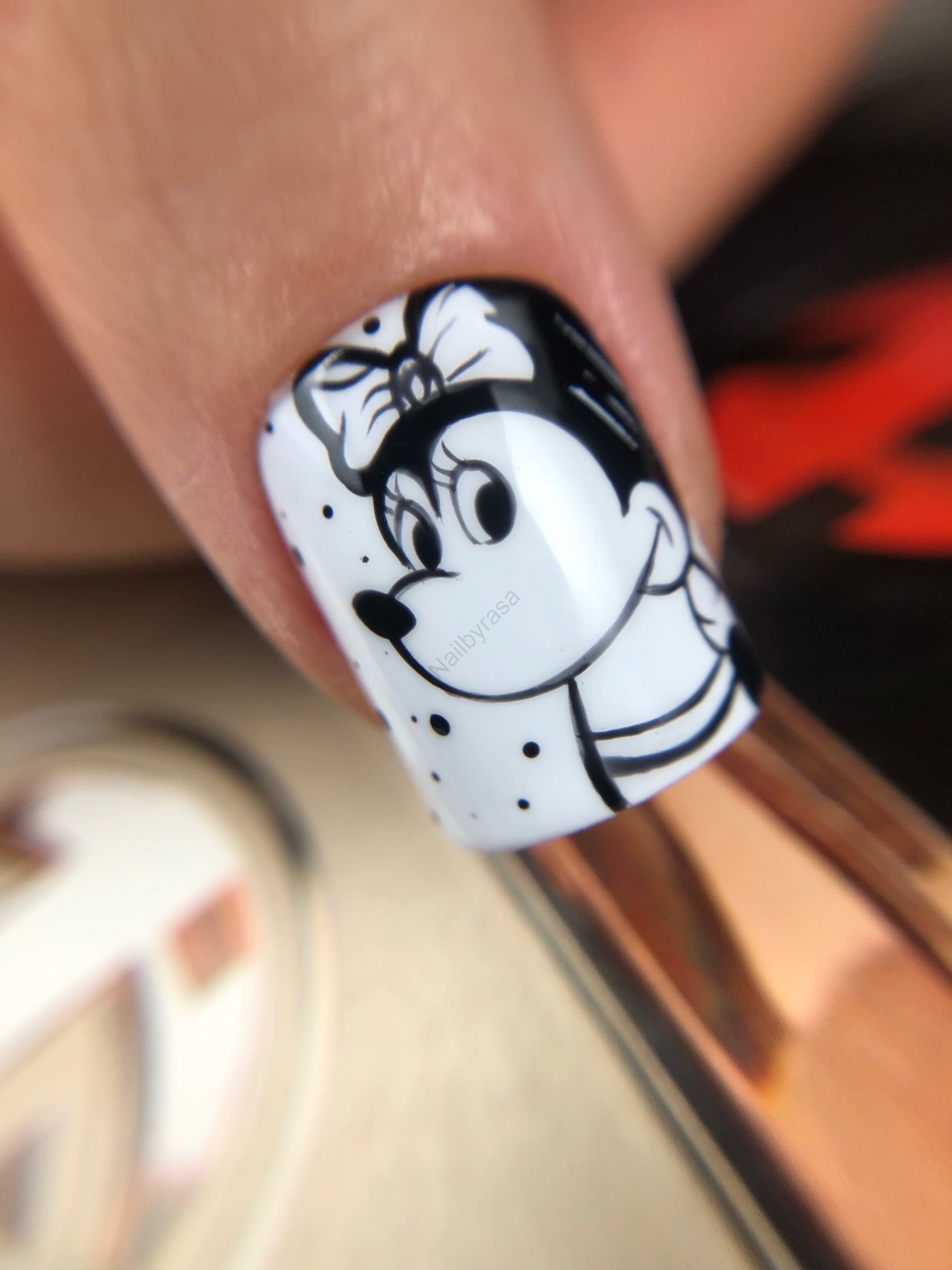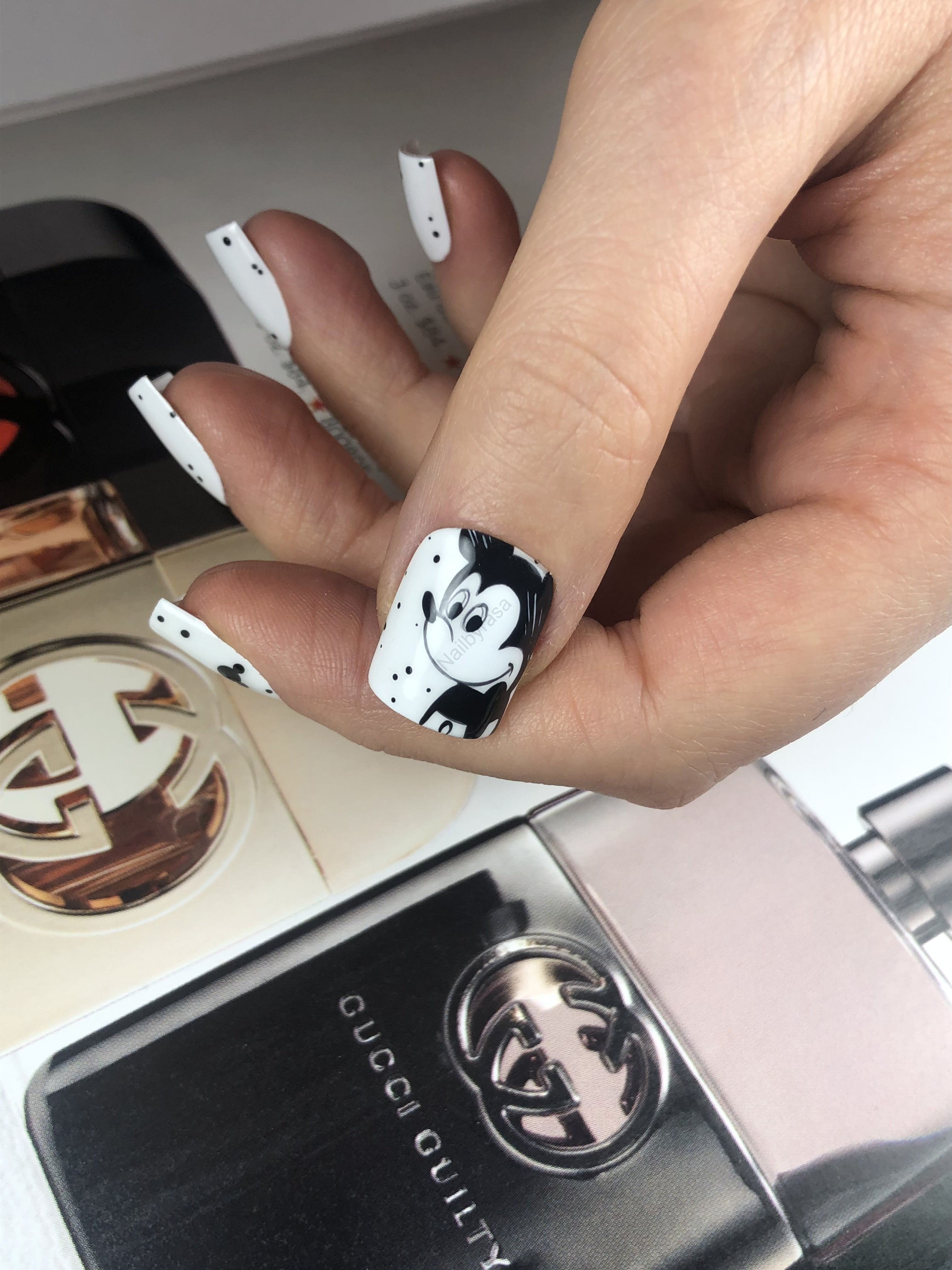 - میکی موس دستساز: روی ناخن شست، چهره میکی موس با جزئیات دقیق طراحی شده است. این سبک طراحی در دسته پرطرفدار ناخن مصنوعی کارتنی و ناخن مصنوعی انیمیشنی قرار میگیرد.