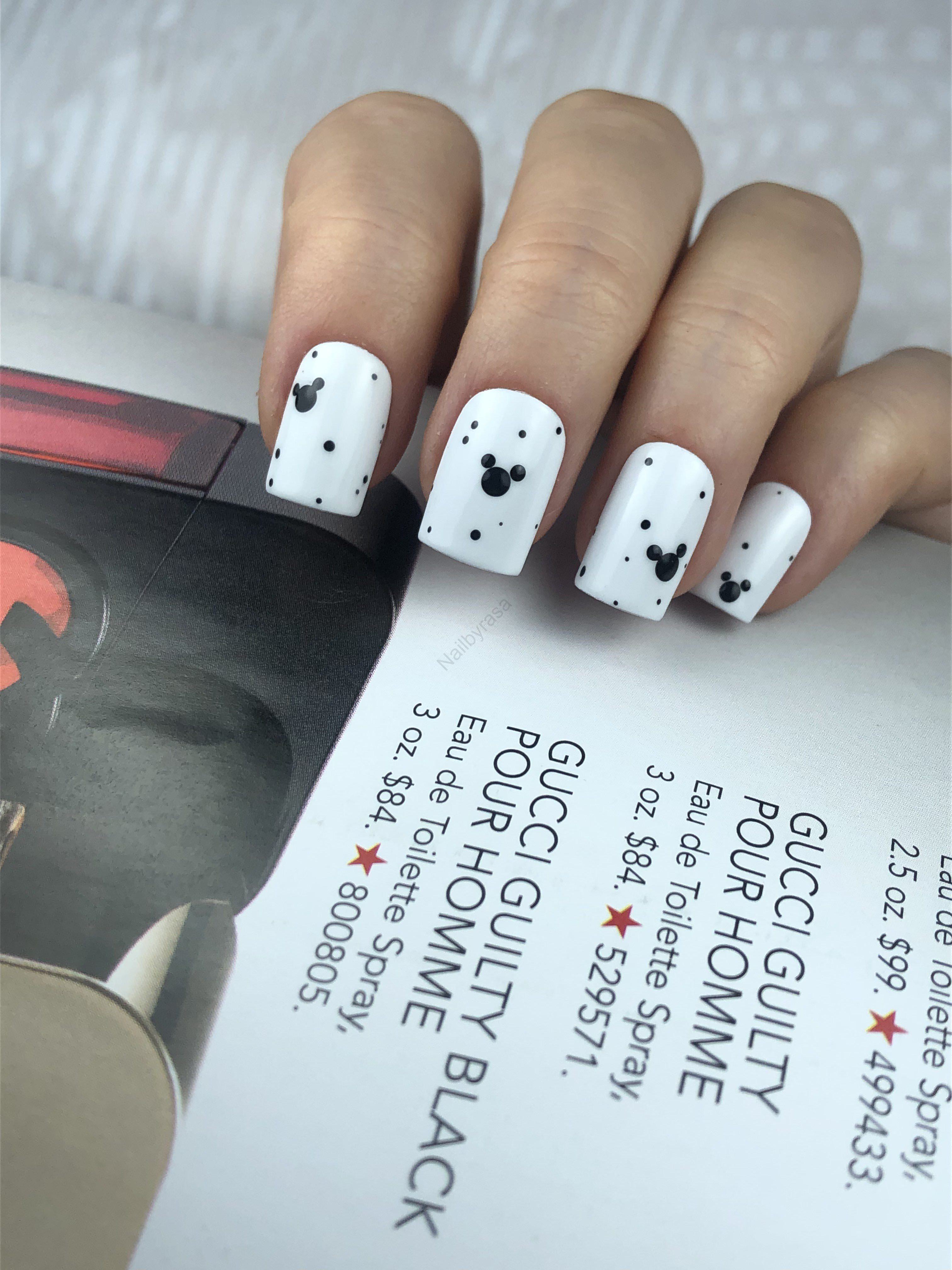 - مینیمالیسم خالخالی: سایر ناخنها با خالهای ریز و سیلوئتهای کوچک میکی تزئین شدهاند که شلوغی طرح اصلی را متعادل میکند.
