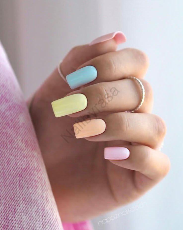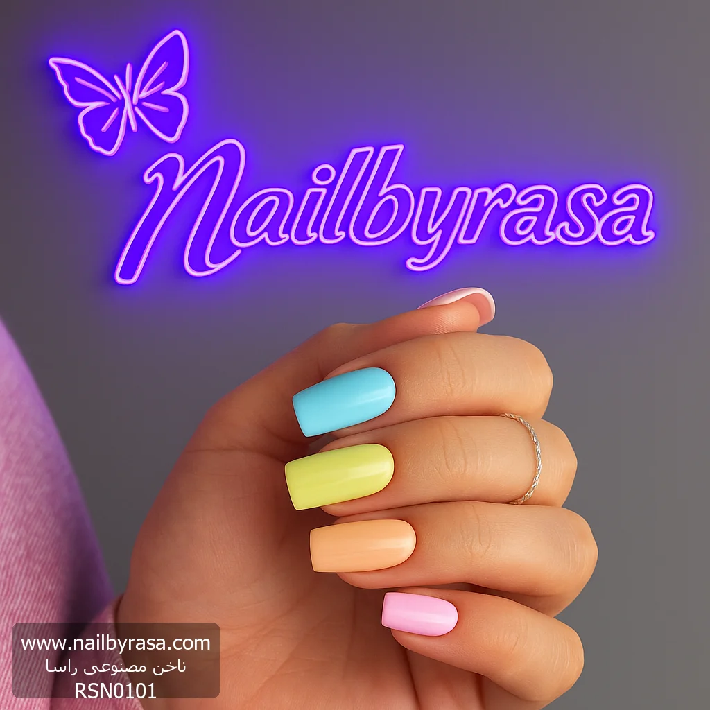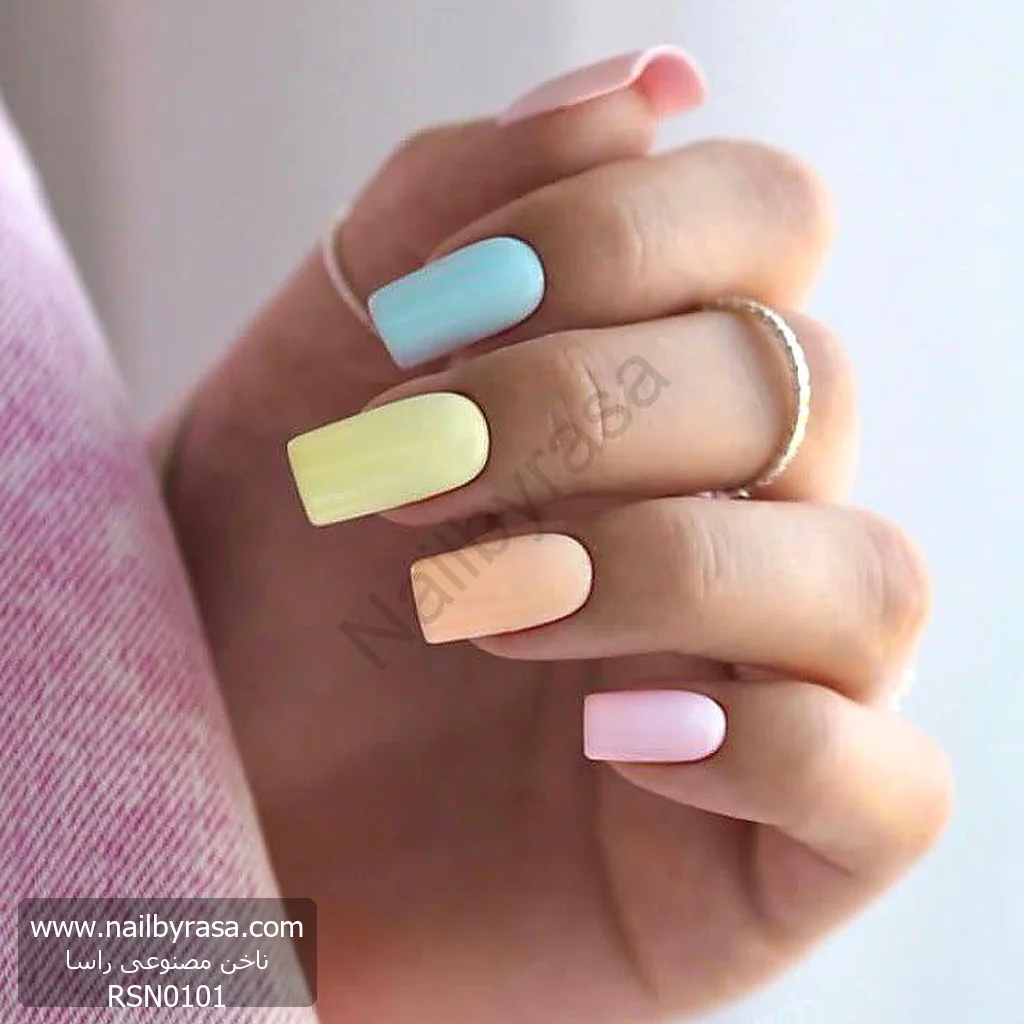 - ترند اسکیتل (Skittle Nails): استفاده از یک رنگ متفاوت برای هر انگشت، یک ترفند عالی برای داشتن ناخنهای شاد بدون نیاز به طرحهای پیچیده است. رنگهای آبی، زرد، هلویی و صورتی استفاده شده در این ست، همگی از یک خانوادهی رنگیِ هموزن (پاستلی شیری) هستند که باعث ایجاد هارمونی بینظیری شده است (دسته ناخن مصنوعی چند رنگ).