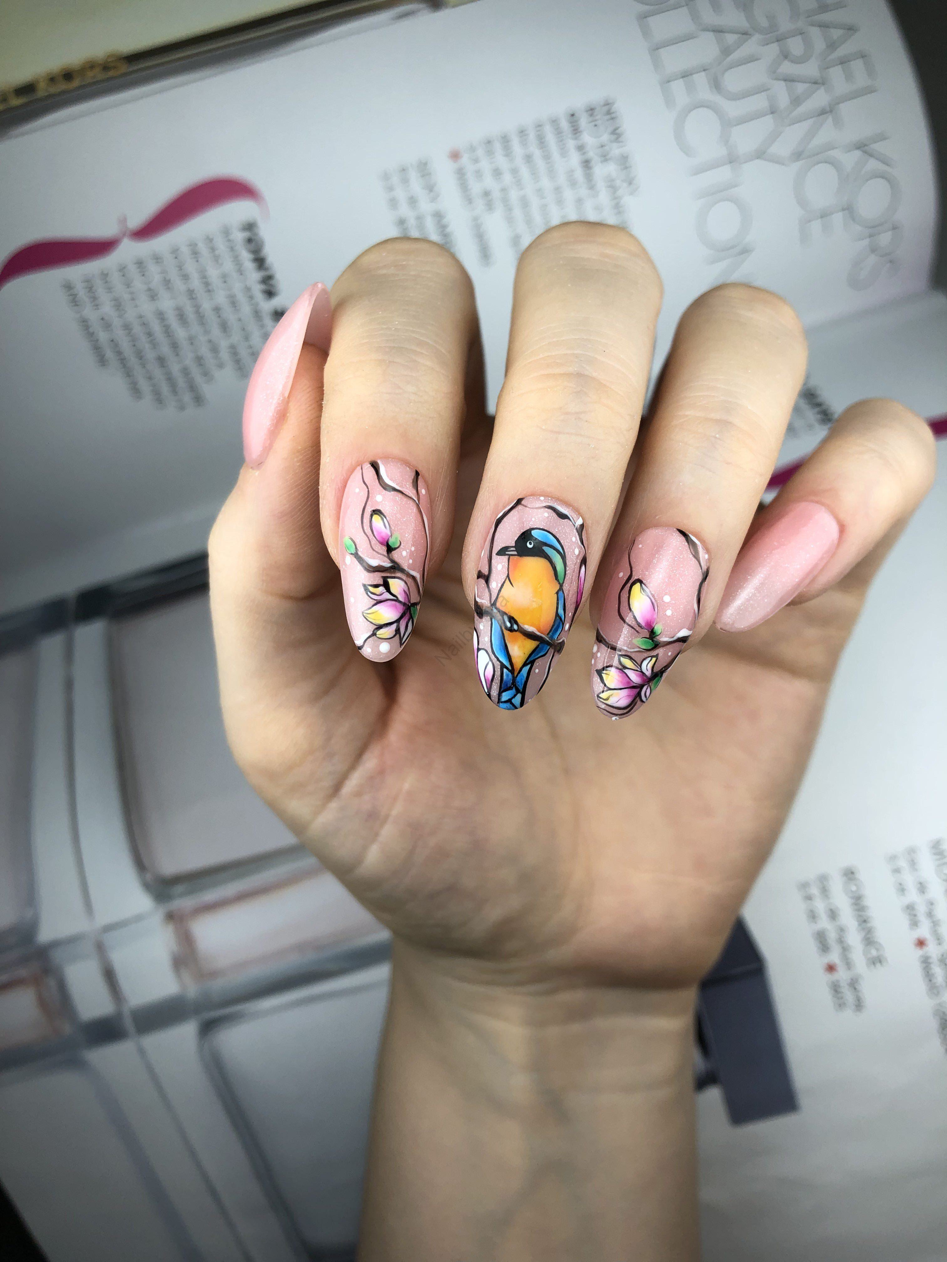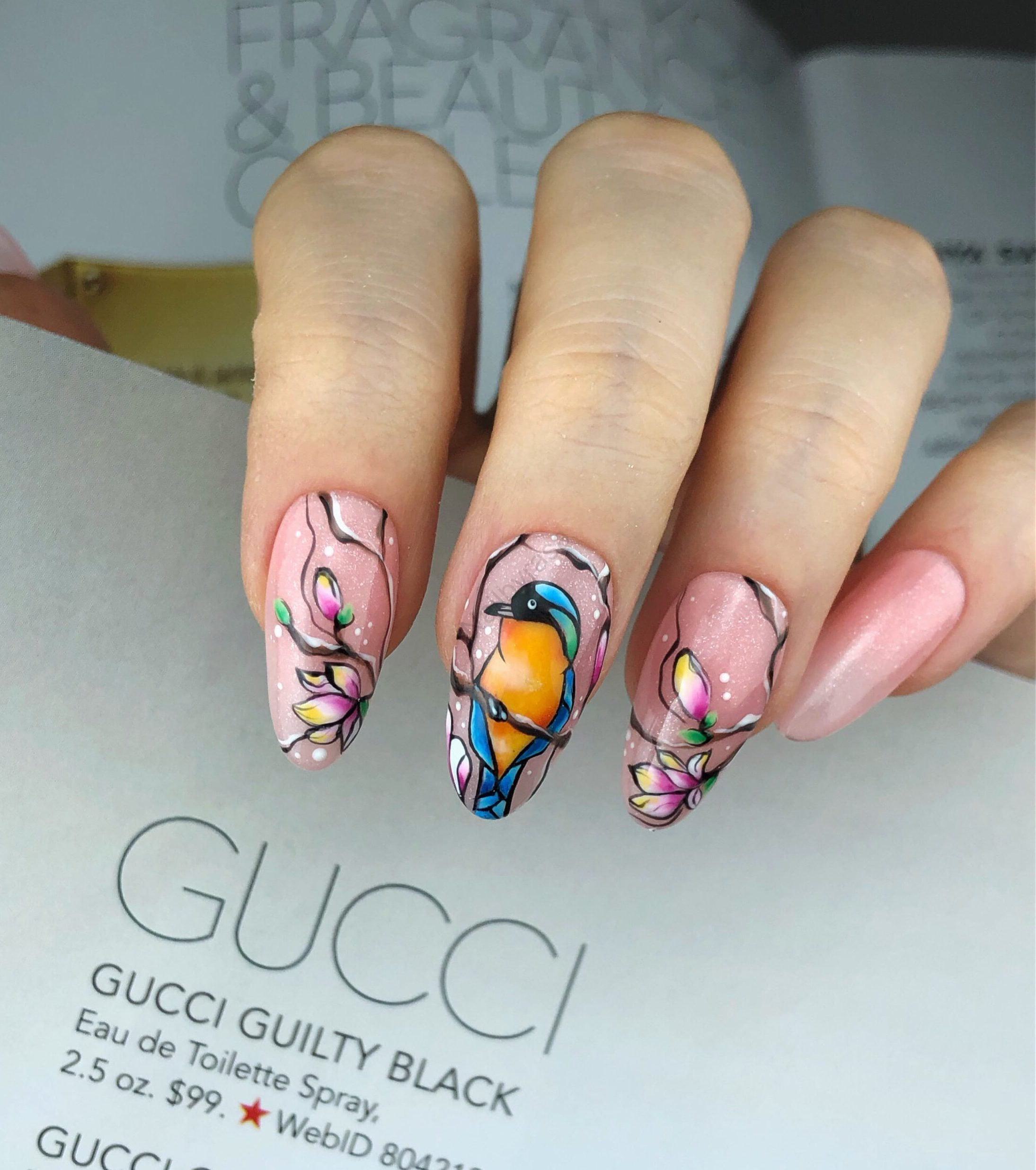 - نقاشی پرنده و شکوفه: نقطه کانونی این ست، طرح پرنده رنگارنگ و شاخههای پرشکوفه است. این سبک طراحی در دسته پرطرفدار ناخن مصنوعی طرح گل قرار میگیرد که همیشه نماد لطافت زنانه بوده است.