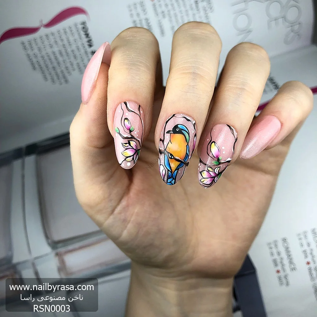 اگر به دنبال ناخنی هستید که فراتر از یک لاک ساده باشد و حکم یک اثر هنری را داشته باشد، ناخن مصنوعی راسا مدل RSN0003 شاهکار شماست. این ست با الهام از بیداری طبیعت، تصویر ظریفی از یک پرنده کوچک و شکوفههای تازه را به نمایش میگذارد که نماد زایش و زیبایی است.