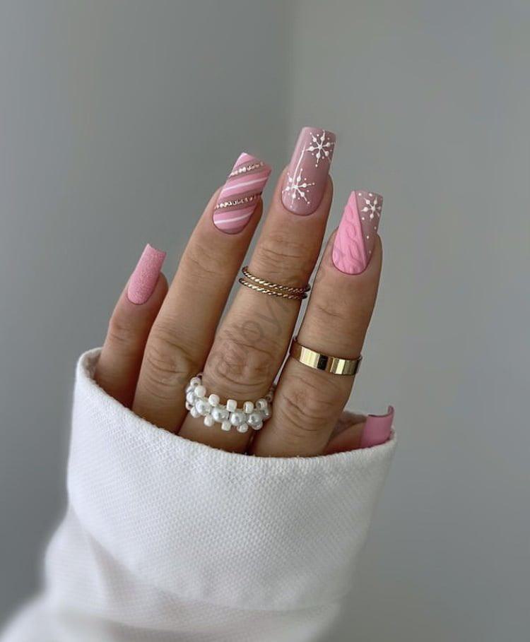 این مدل انتخابی جسورانه برای جشنهای زمستانی، ولنتاین و تولدها است. اگر میخواهید در عکسها متفاوت باشید و استایل باربیگونه خود را حتی در فصل سرما حفظ کنید، این مدل بهترین گزینه از کالکشن ناخن مصنوعی زمستانی است.