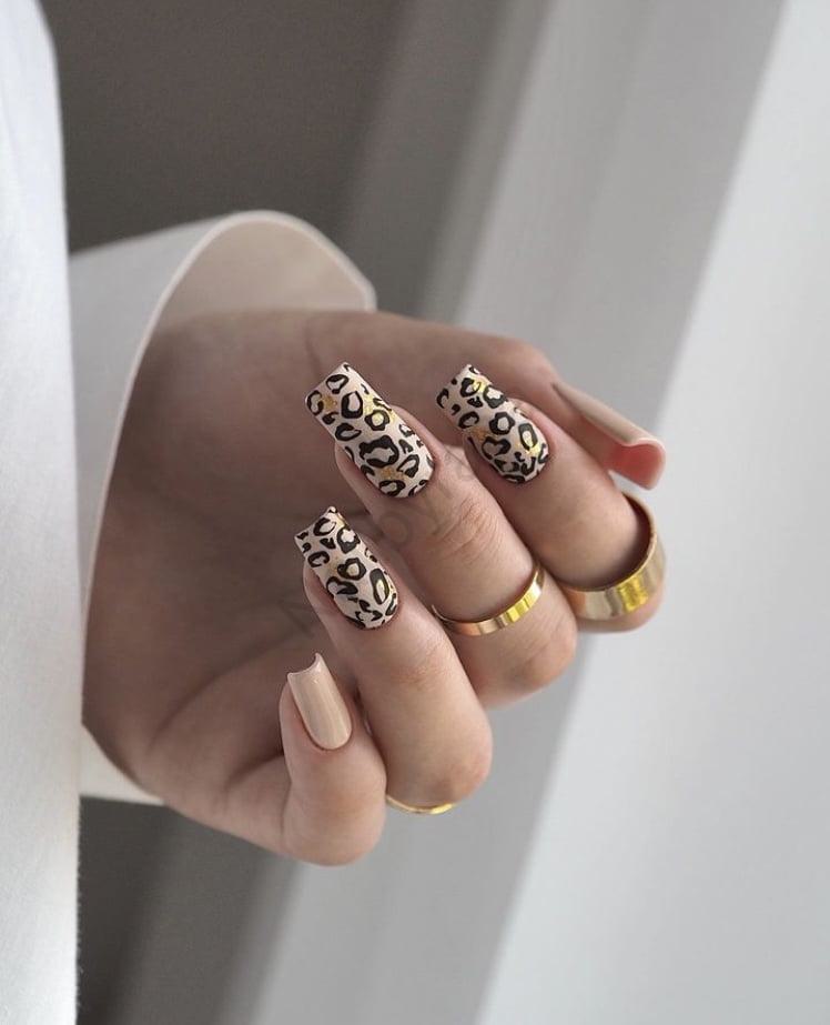 - بیس کرم نود: انتخاب رنگ کرم ملایم به عنوان پسزمینه، باعث شده تا طرح شلوغ پلنگی، بسیار ملایم و چشمنواز به نظر برسد و با هر رنگ پوستی هارمونی داشته باشد (مشاهده ناخن مصنوعی کرم/نود).