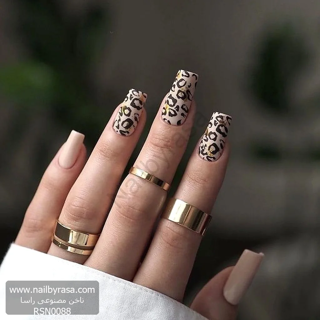 - پلنگی با ورق طلا: لکههای پلنگی در این مدل صرفاً چاپ نیستند؛ در مرکز لکهها از تکههای ورق طلا استفاده شده که زیر نور (حتی با وجود مات بودن) درخشش ظریف و لوکسی دارند (دسته ناخن مصنوعی با ورق طلا).